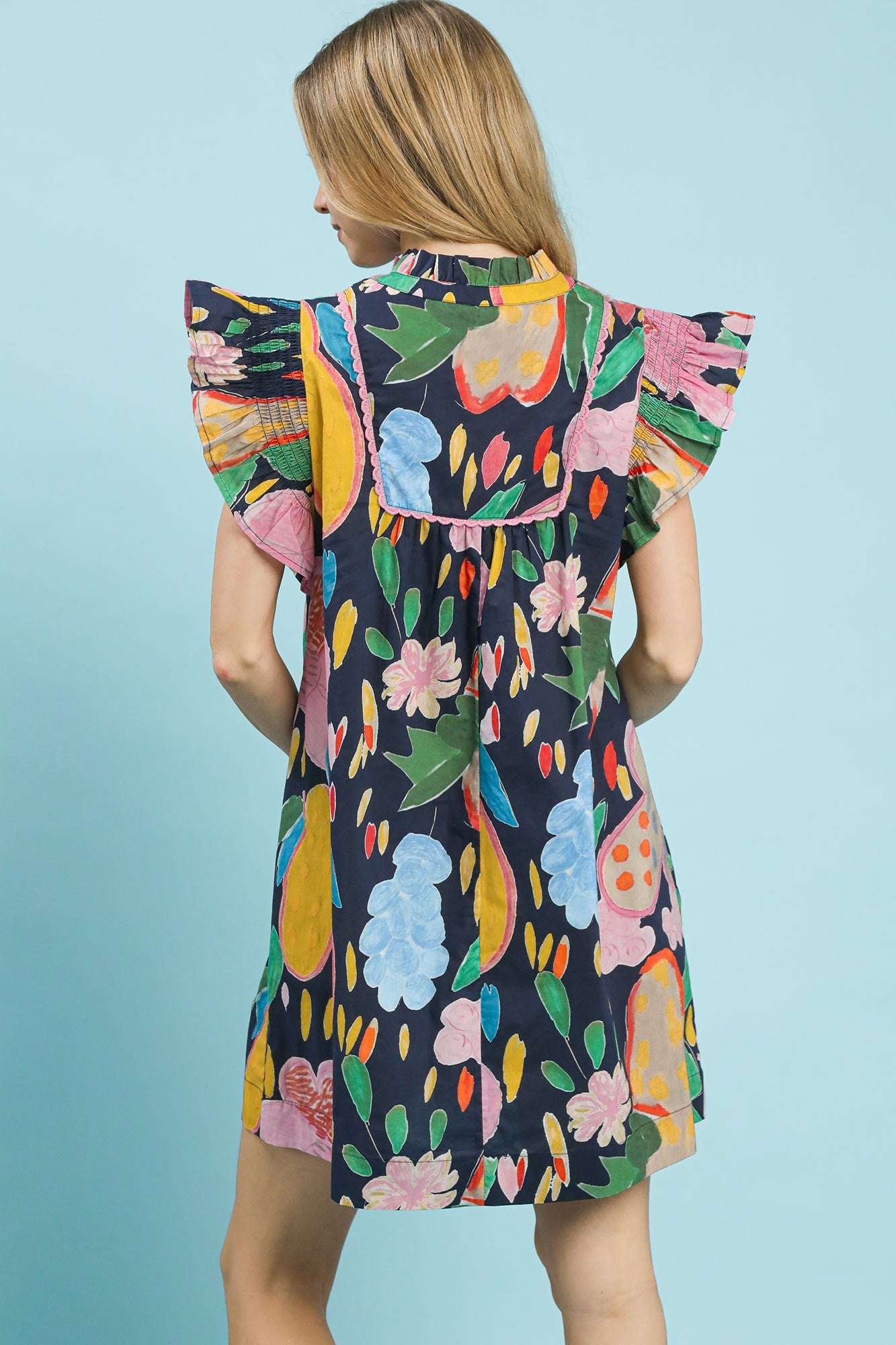 An abstract floral dress designed with a flattering V-neckline accented by contrast trim for a refined touch. Smocked flutter sleeves add soft texture and gentle movement, while the relaxed, flowy silhouette creates an easy, comfortable fit. A versatile piece that transitions effortlessly from casual days to more polished occasions.