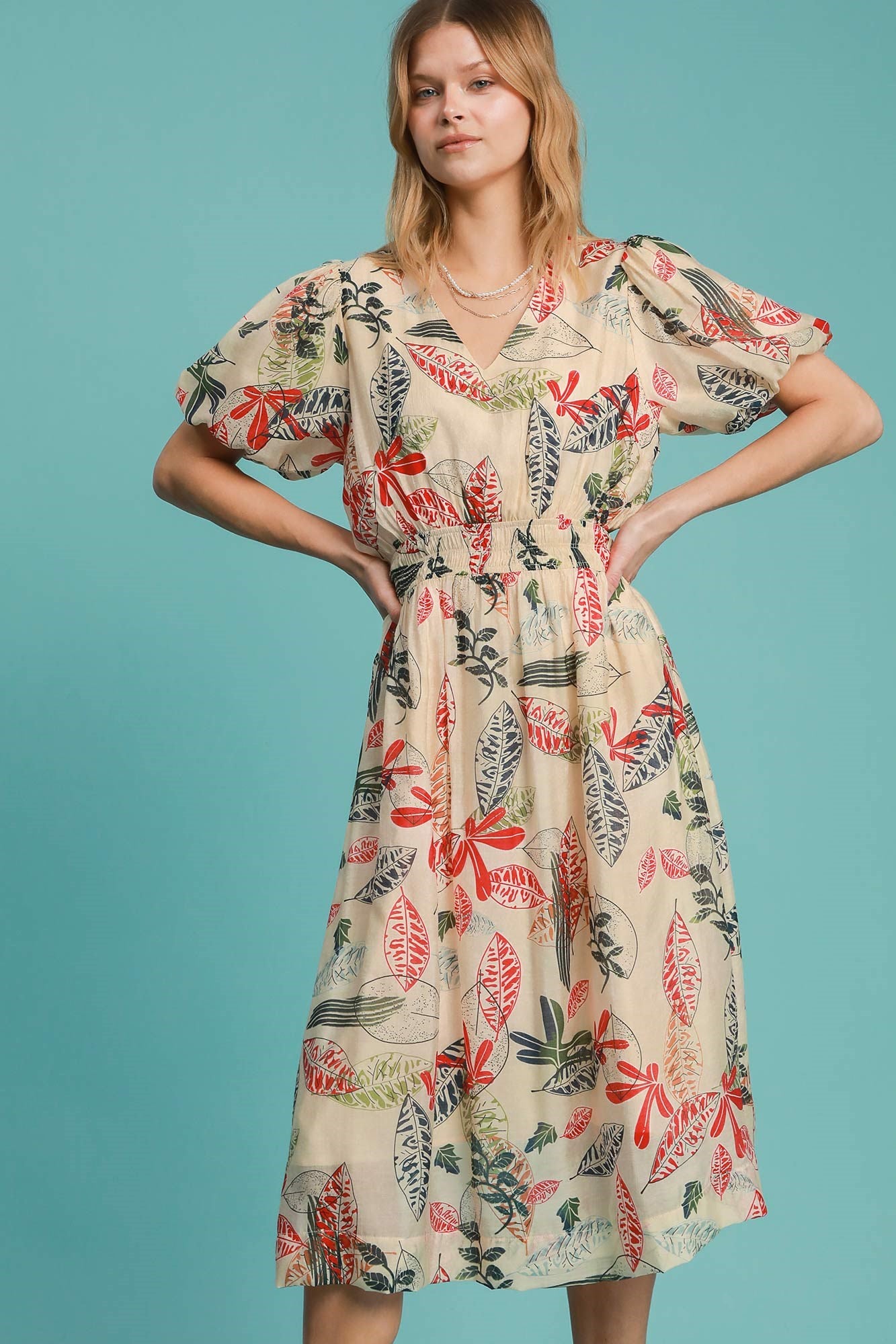 Make a statement in this abstract print midi dress, styled with a flattering V-neckline and feminine puff sleeves. The smocked waistband defines the waist while offering all-day comfort, flowing into an easy A-line silhouette. Finished with a soft lining for effortless wear, this midi is a versatile piece that moves beautifully from day to evening.