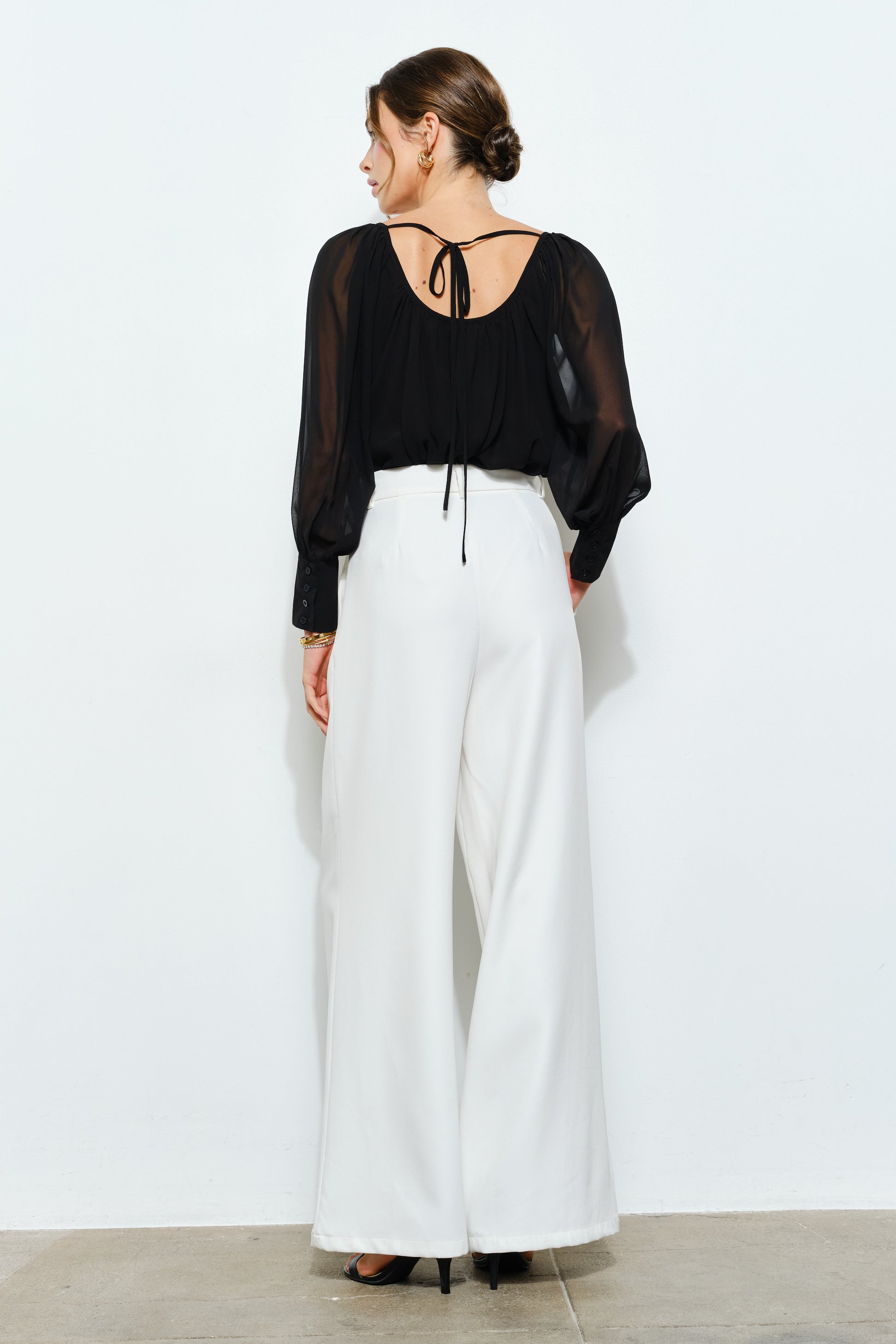 A sheer chiffon blouse with delicate beading along the neckline brings easy elegance to any look. The relaxed silhouette and lightweight drape create effortless movement, while long sleeves with wide cuffs and covered buttons add a polished touch. A rounded back opening with a tie closure completes the design with subtle femininity, making it perfect for dressy office days or elegant brunches.