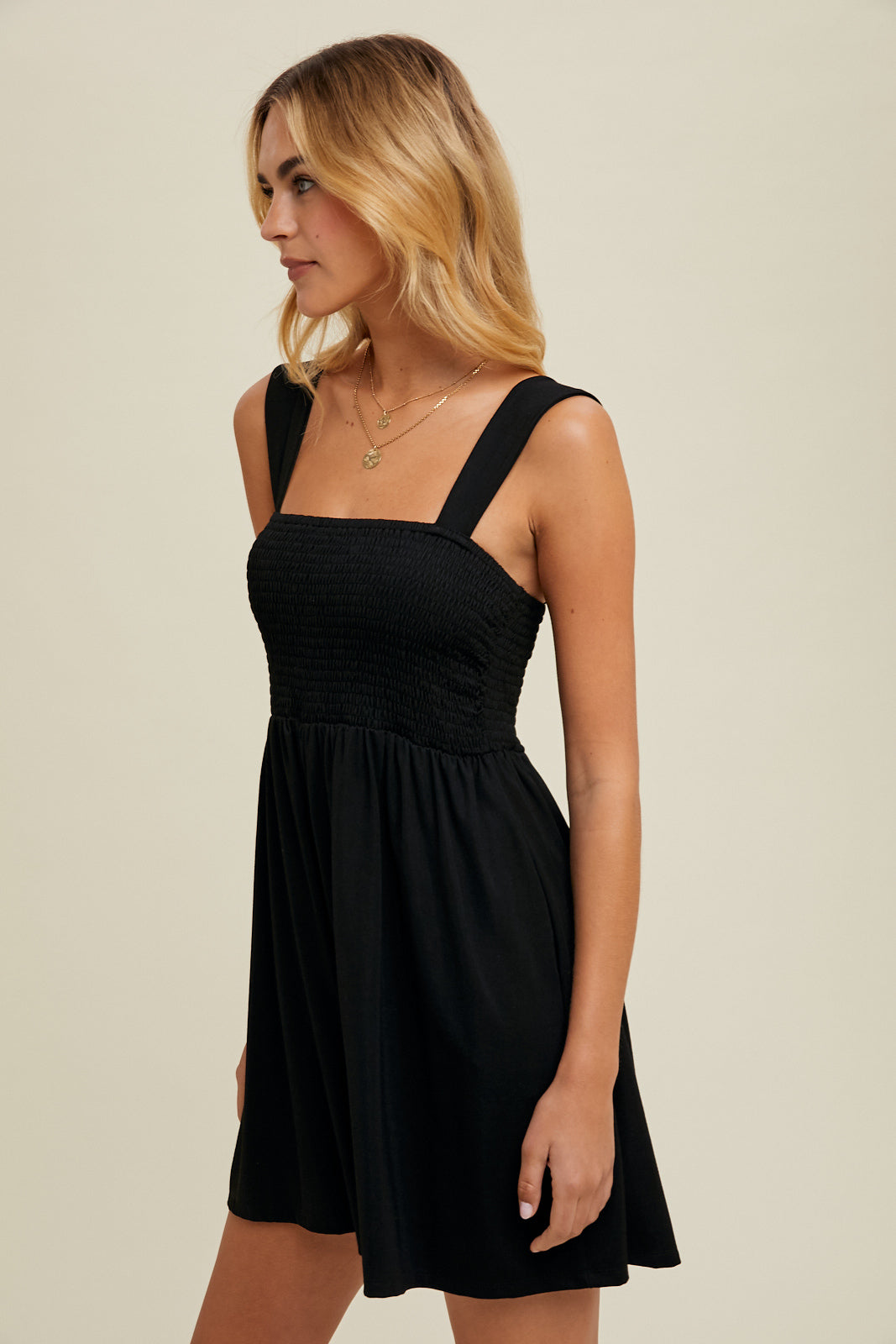 This playful smocked cami romper in classic black features a comfortable smocked bodice and handy side pockets, perfect for keeping your essentials close while you enjoy carefree days. Its lightweight knit fabric offers a relaxed fit that moves with you, making it an ideal choice for sunny adventures or casual hangouts.