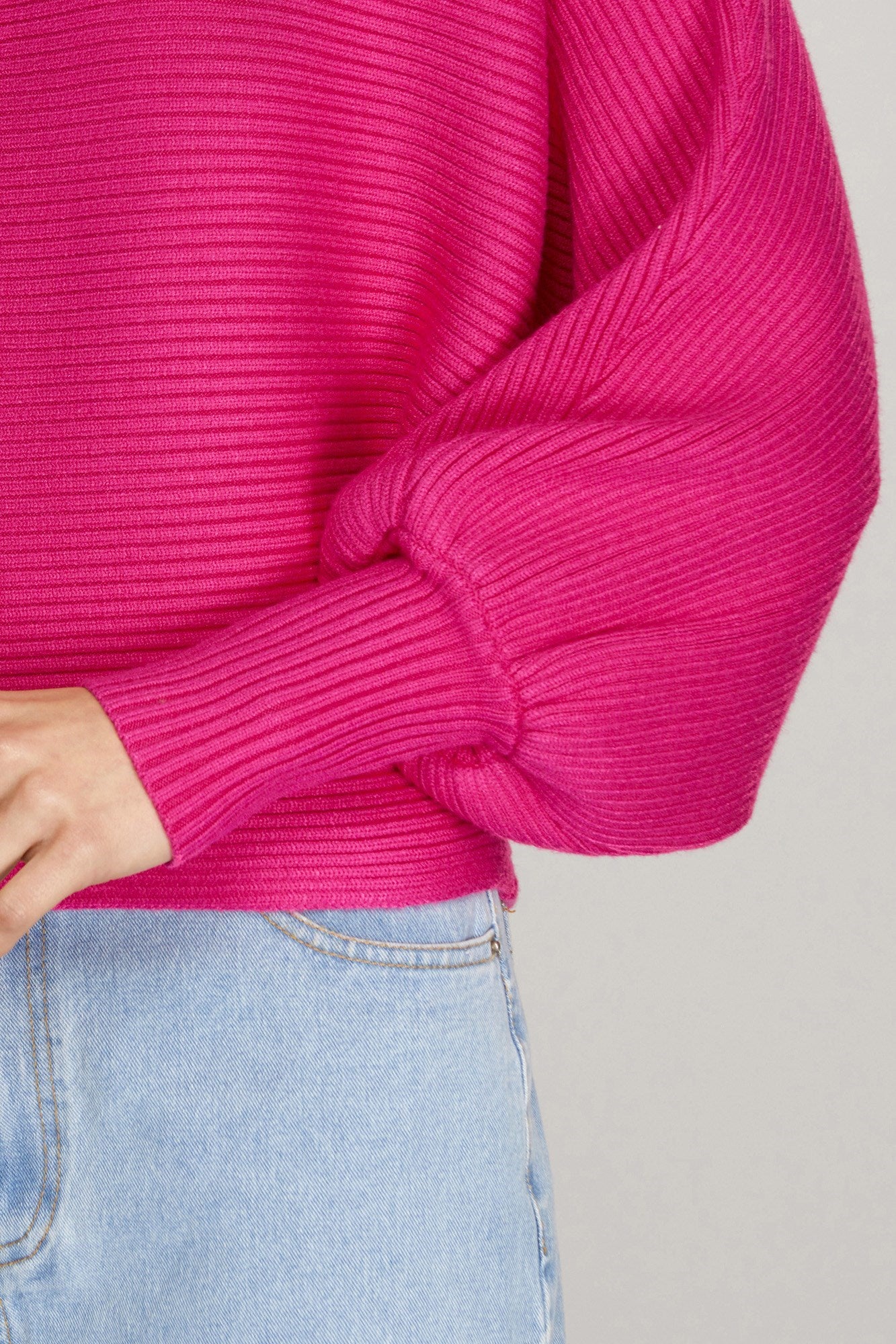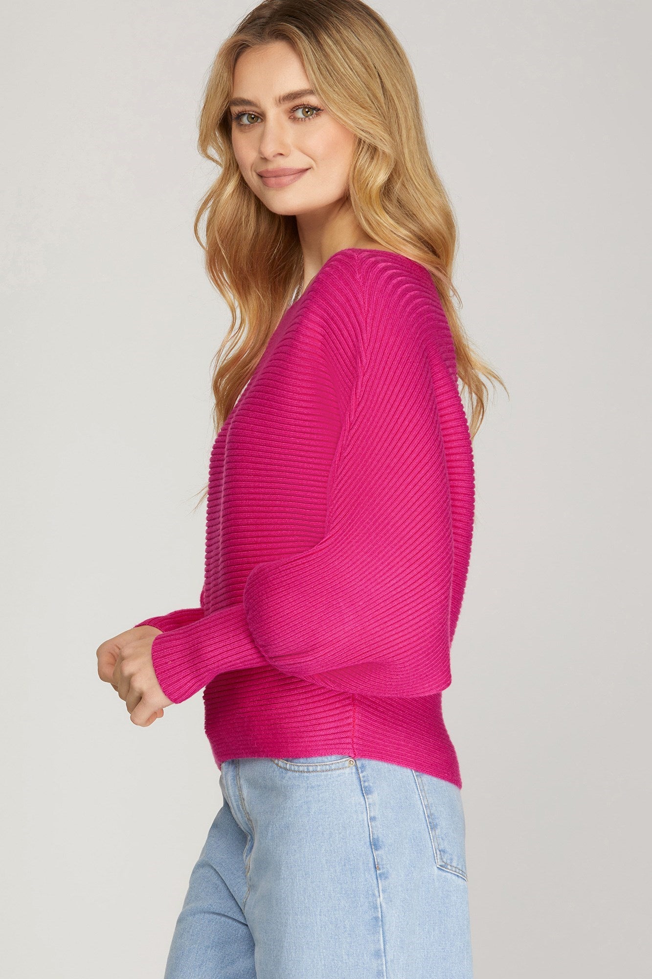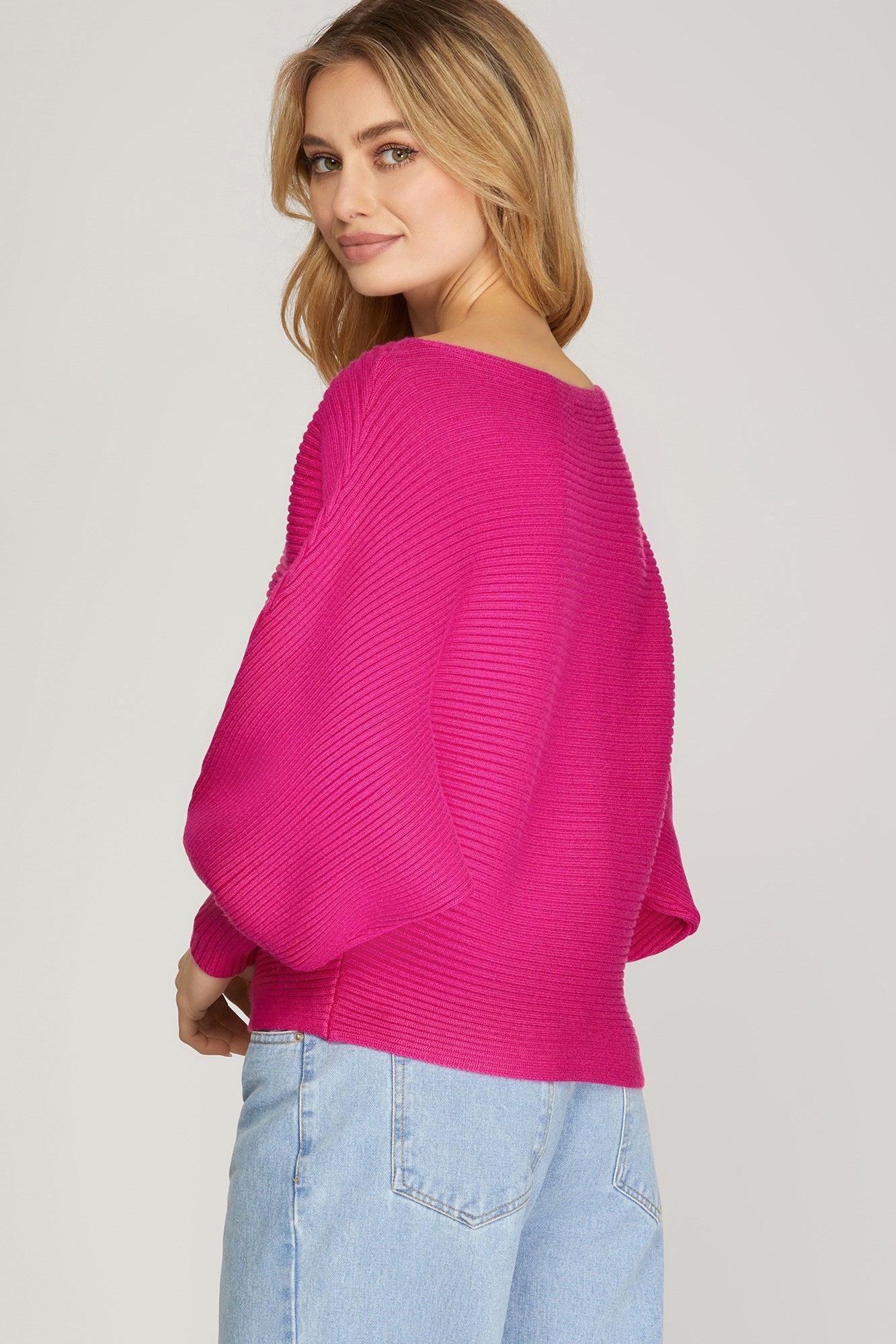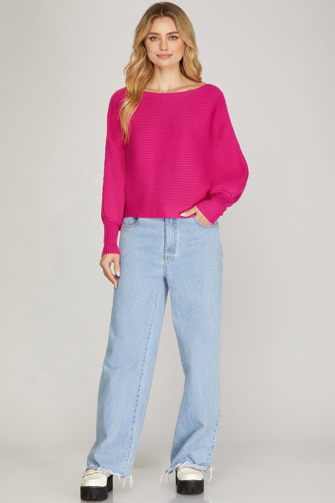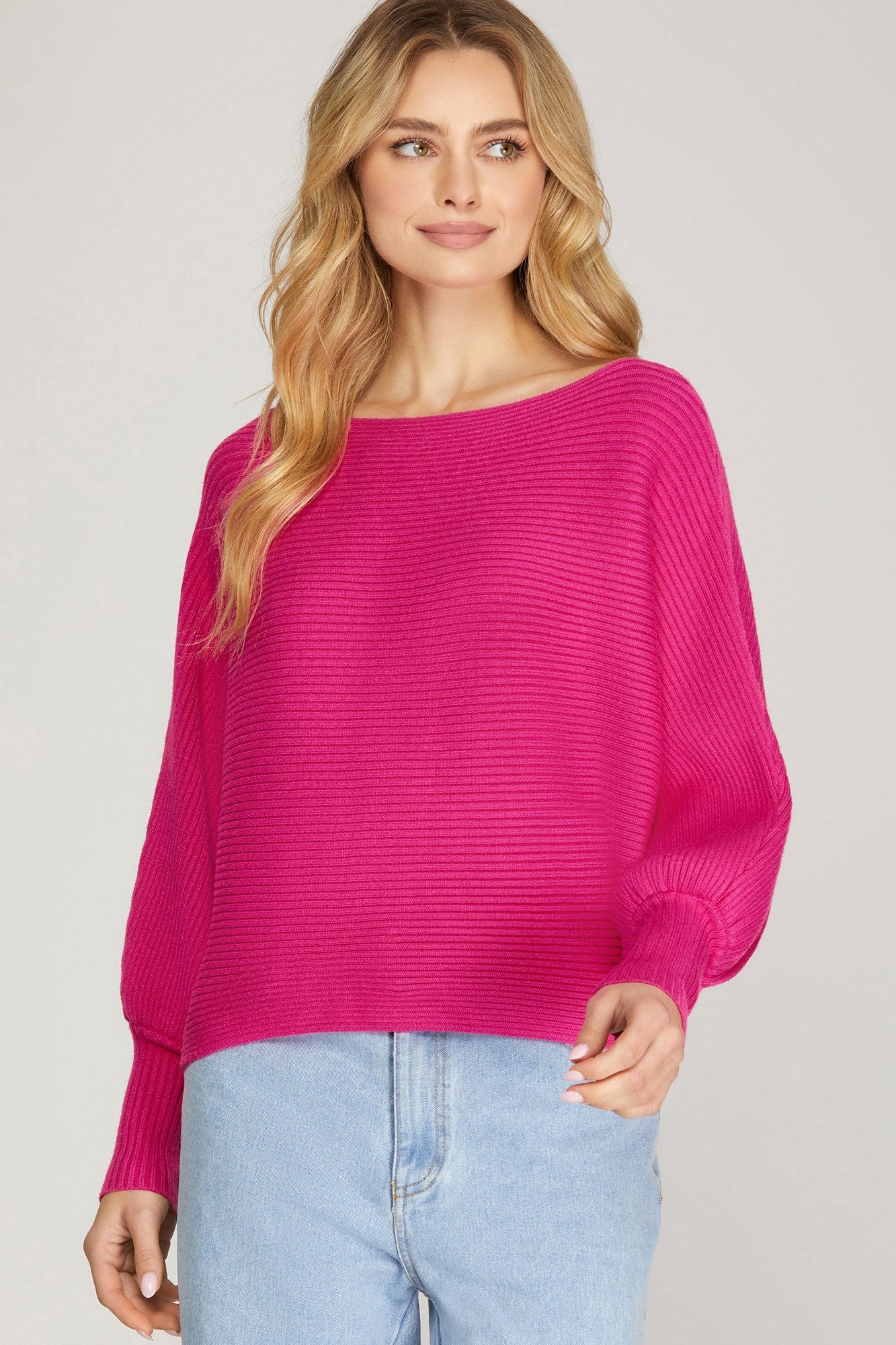 This cute and chic sweater by She & Sky features long, dolman sleeves, a boat neckline, and a rib knit style top. Comes in a hot pink color.