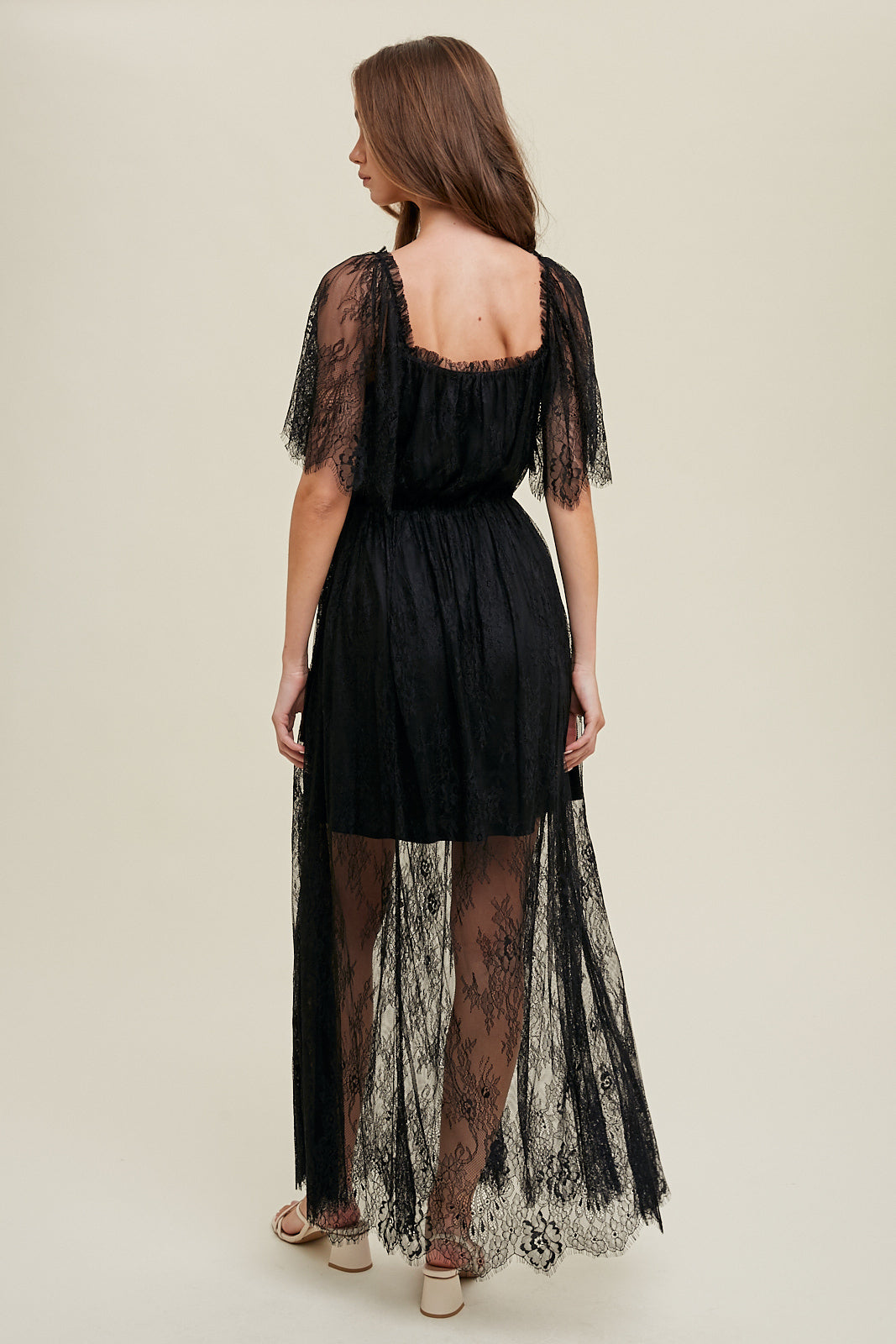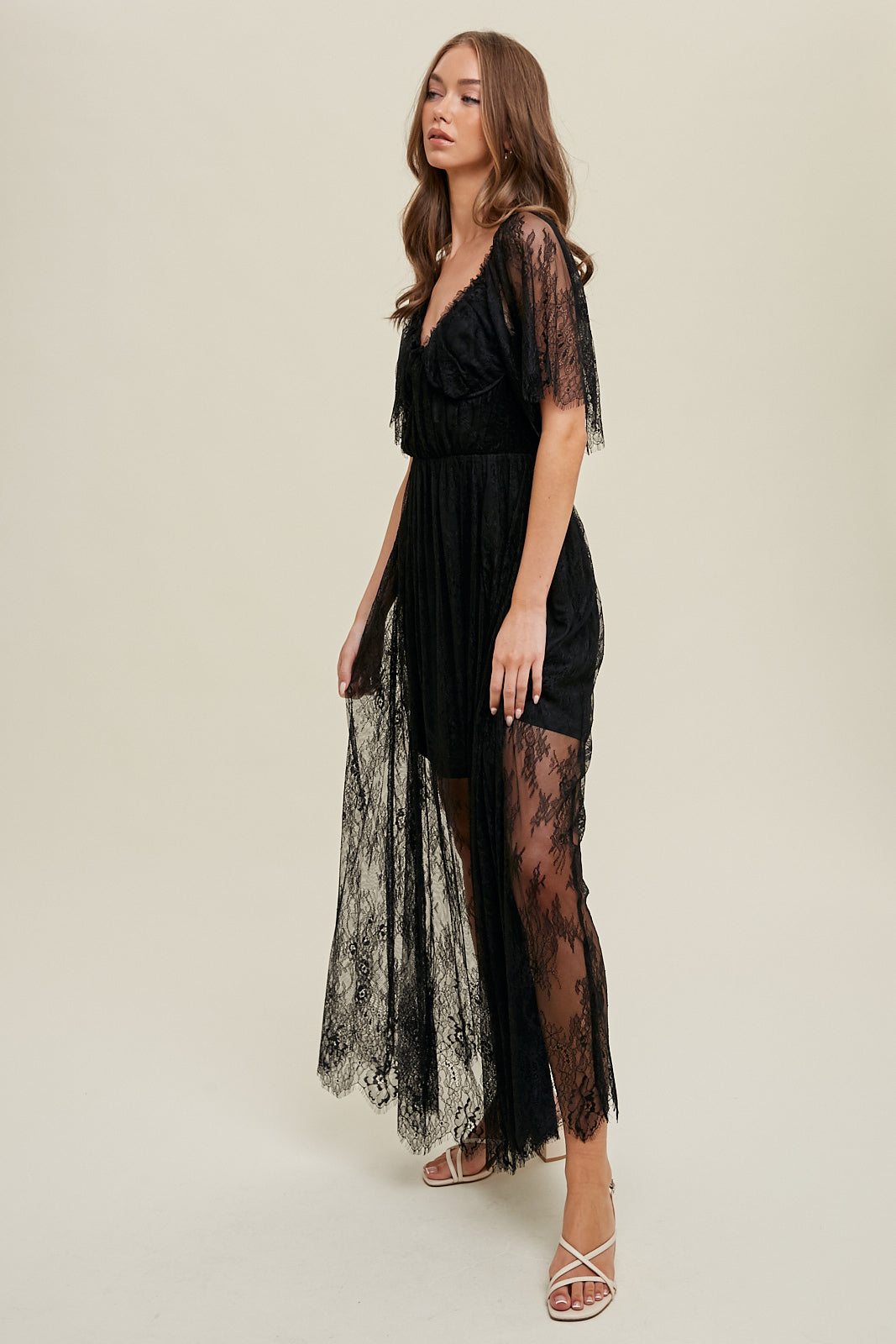 A gorgeous and stunning black dress with floral patterned lace sleeves and long dress skirt. The dress features a shorter, black inner lining and has a deep v-neckline.