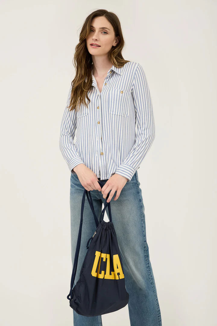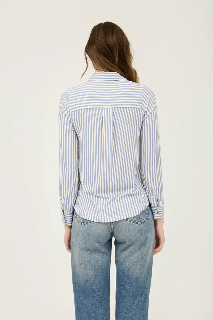 Stay stylish with our Striped Button Down Top. This playful top features two front pockets with a single button closure, perfect for carrying small essentials. The button-up design adds a touch of sophistication, while the dusty blue stripes add a unique flair.