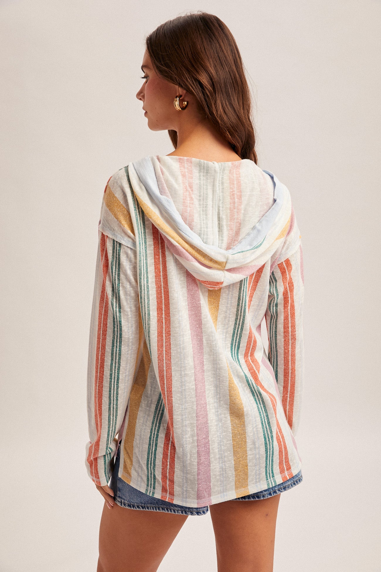 A cozy pullover hoodie featuring a vibrant multi-color mix and button-up front for a playful, modern twist on casual layering. Soft knit fabric and a relaxed fit provide all-day comfort, while the versatile design pairs effortlessly with jeans, leggings, or shorts for an easy, chic look.