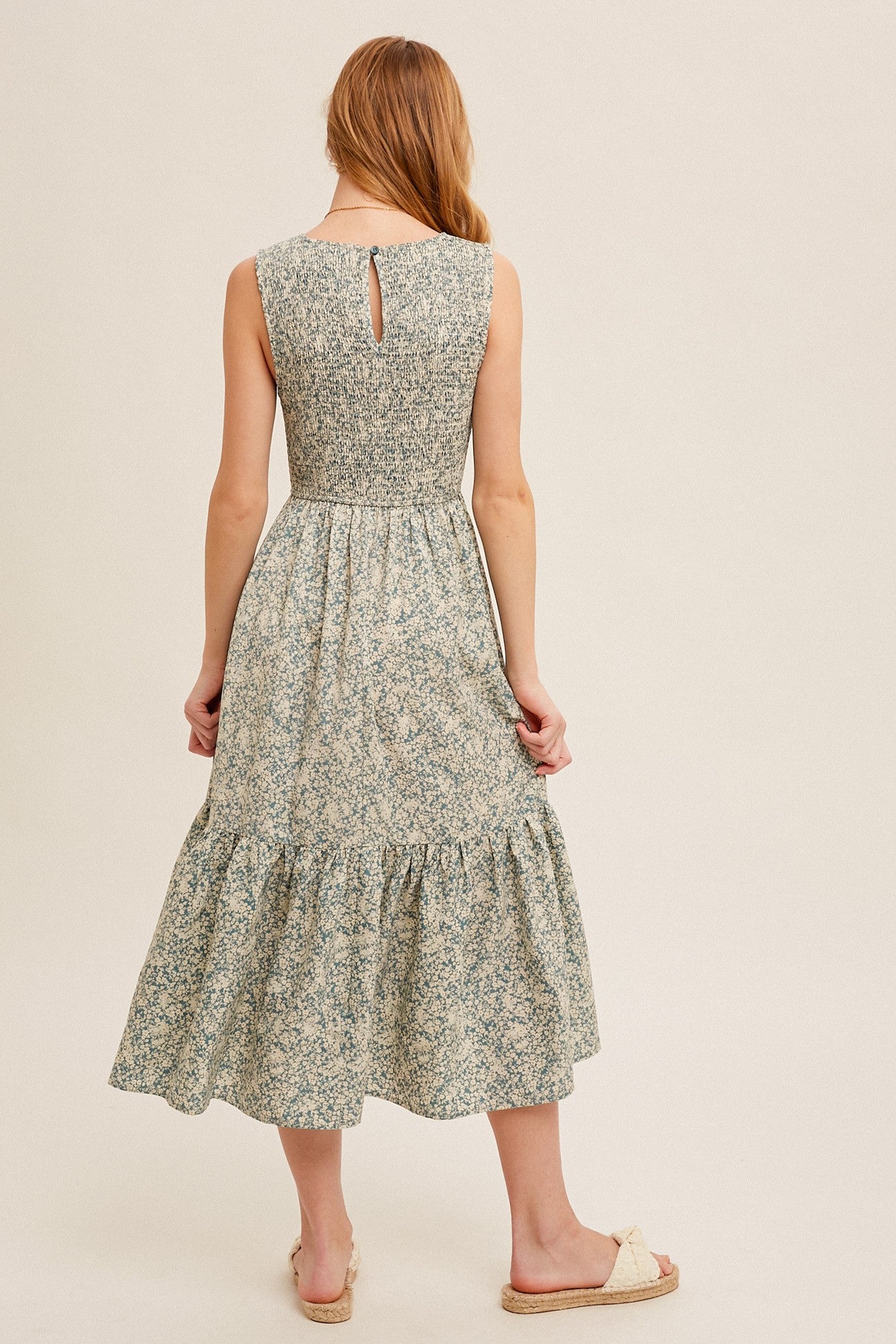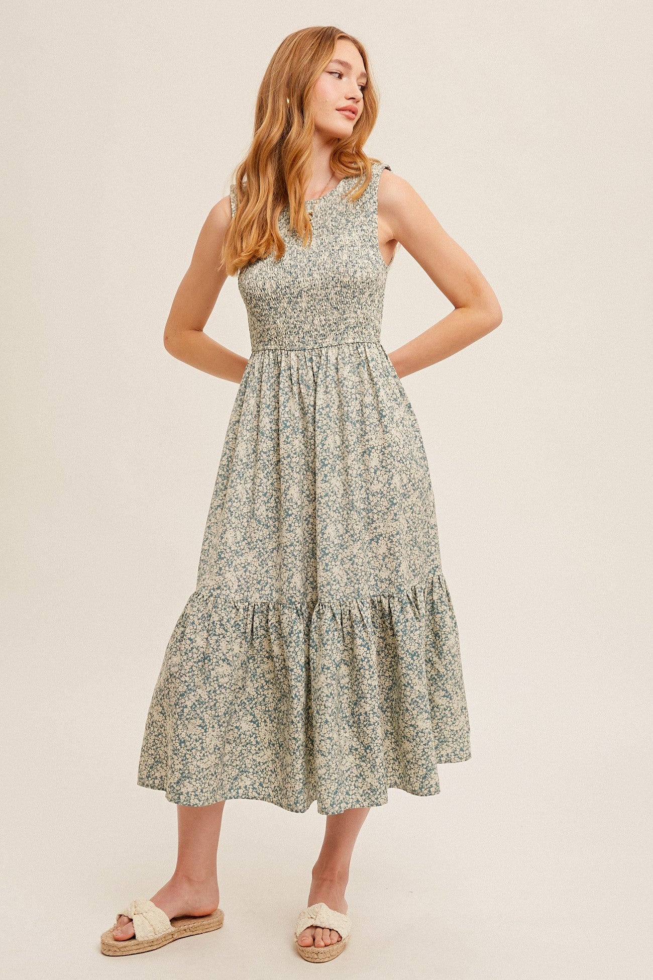 Step out in style with this teal midi dress featuring a smocked bodice and sleeveless design, you'll be comfortable and chic all day long!