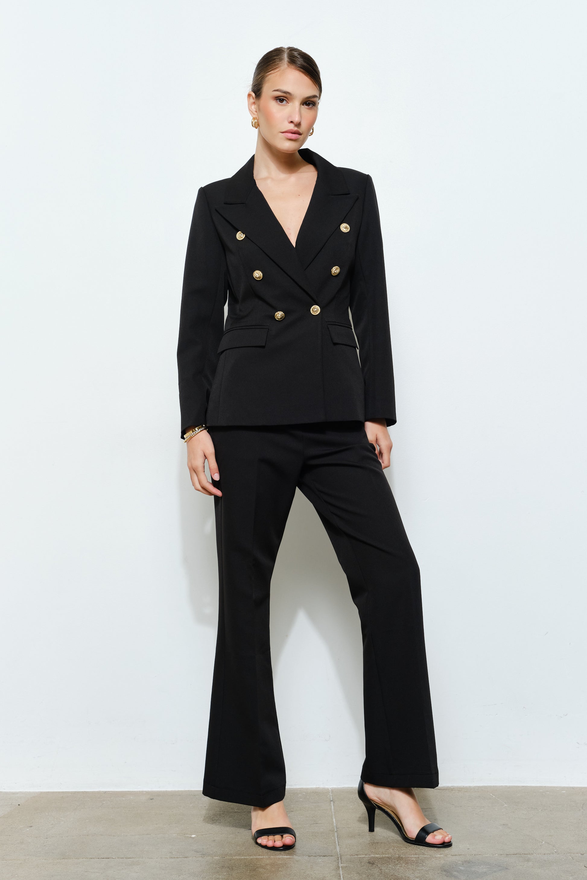 These high-waisted tailored pants feature a smooth, polished finish with a flattering flared leg that elongates the silhouette. Designed with side pockets and a zipper-and-hook closure, they offer both style and practicality. Comfortable enough for all-day wear yet structured for a refined look, they transition seamlessly from office hours to evenings out. Comes in a solid black color.