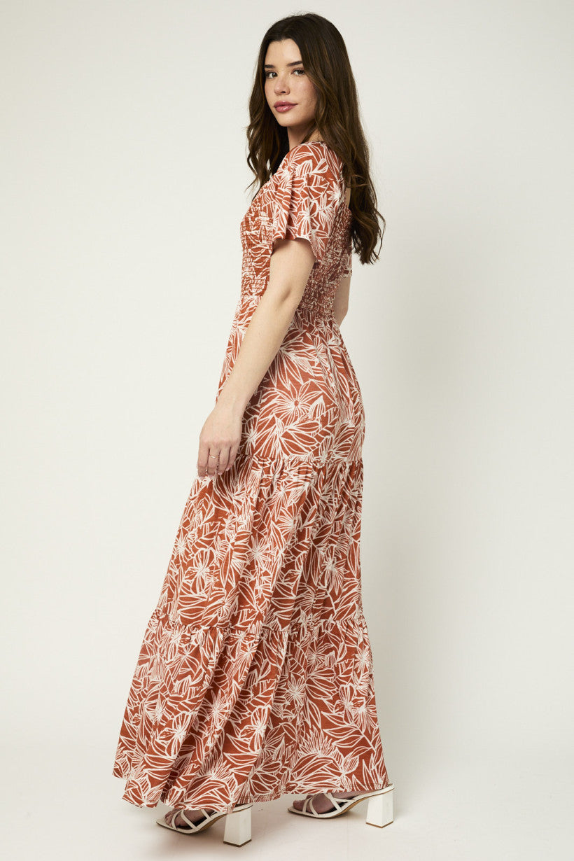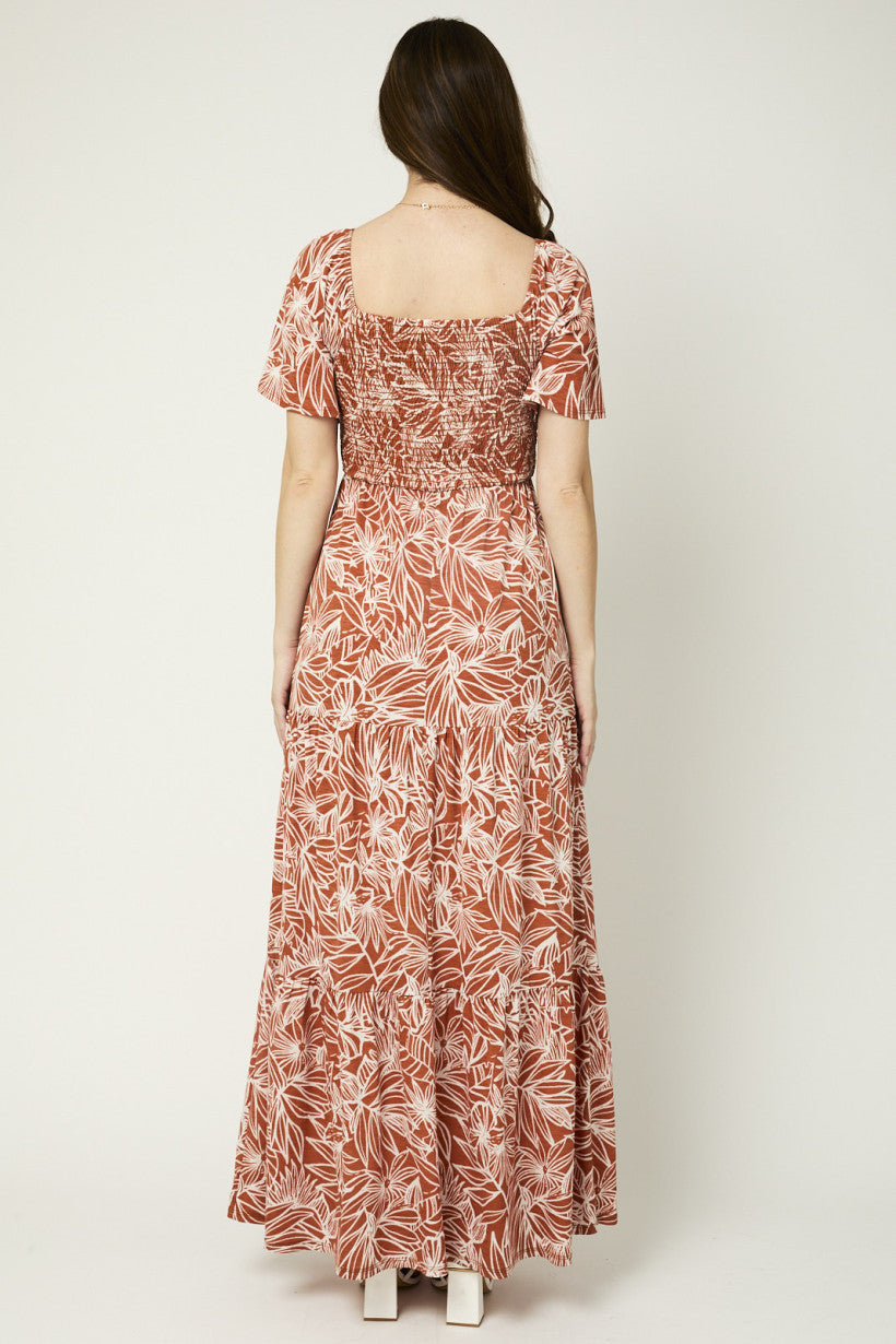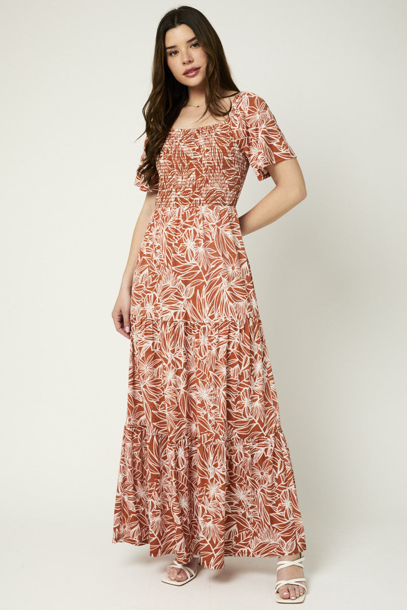 This dress features a short sleeve square neck top and smocking for a flattering fit. The maxi length showcases a beautiful floral print.