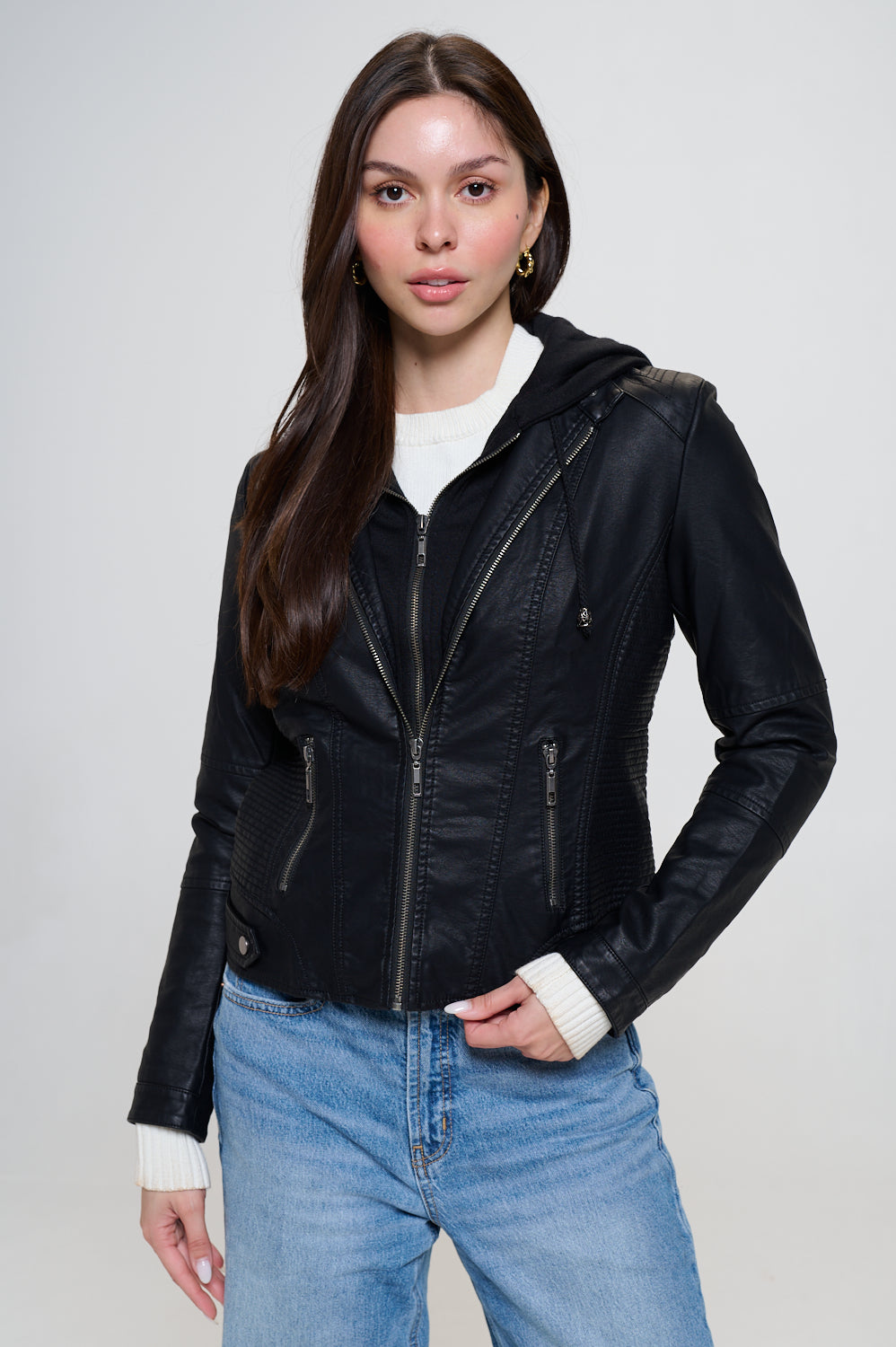 Stay effortlessly stylish in this vegan leather zip jacket! Featuring a sleek hood and convenient zip pockets, it’s the perfect blend of fashion and function. With long sleeves for extra warmth, this jacket keeps you looking sharp while staying cozy.