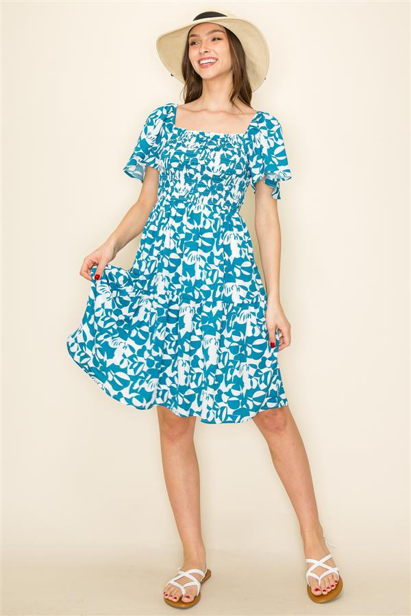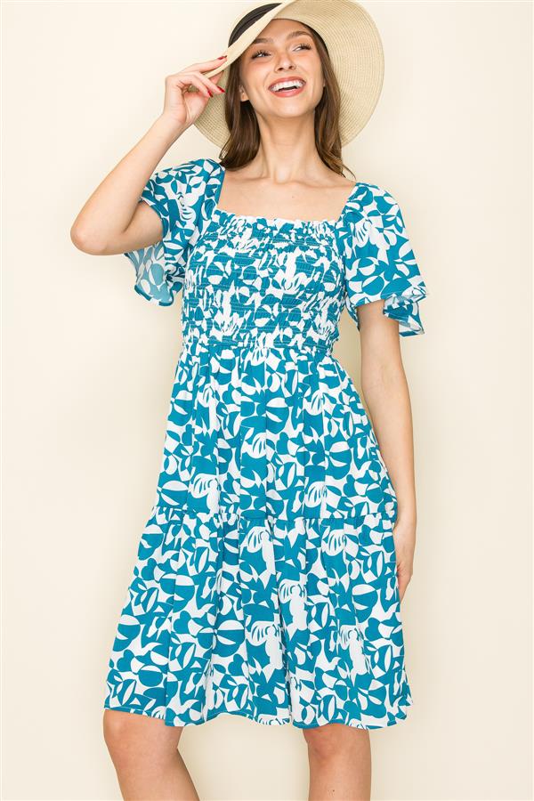 Featuring a smocked bodice, flyaway short sleeves, and a fully lined tiered geo print design, this dress will have you feeling fun and flirty all day long.