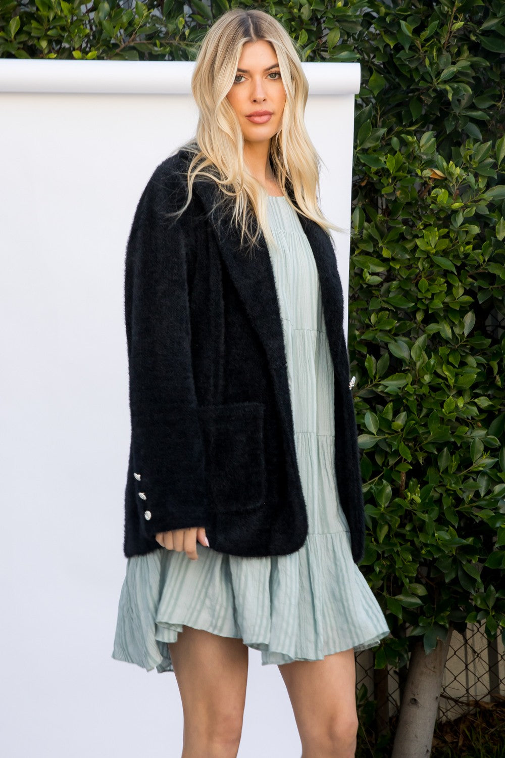 Elevated with subtle glamour, this ultra-soft blazer is crafted in an angora-like fabric that feels as good as it looks. The tailored silhouette features long sleeves, patch pockets, and jeweled buttons at the front and cuffs, adding a touch of sparkle to its classic design. Perfect for dressing up denim or layering over evening looks, it’s a versatile piece with effortless sophistication.