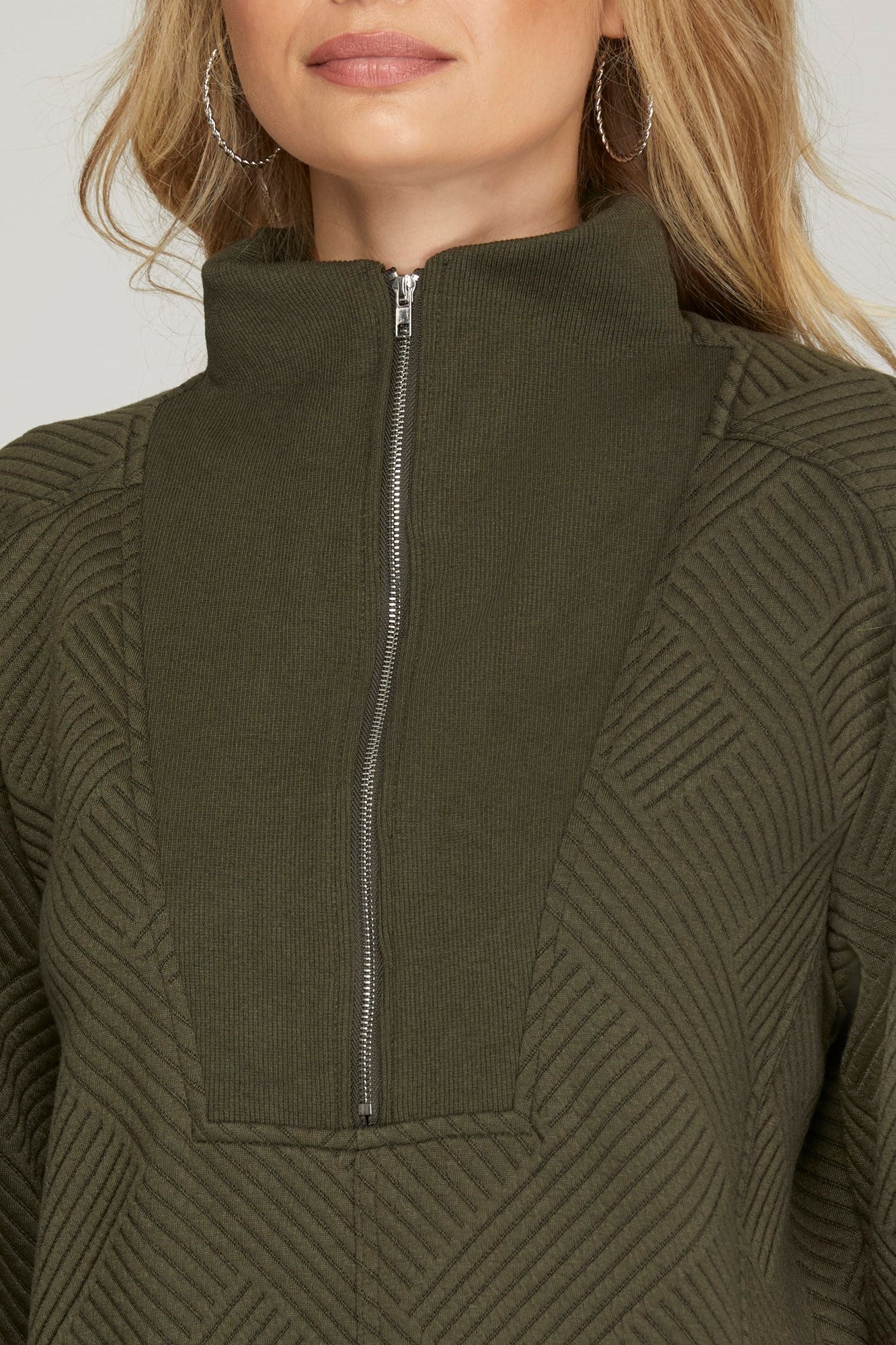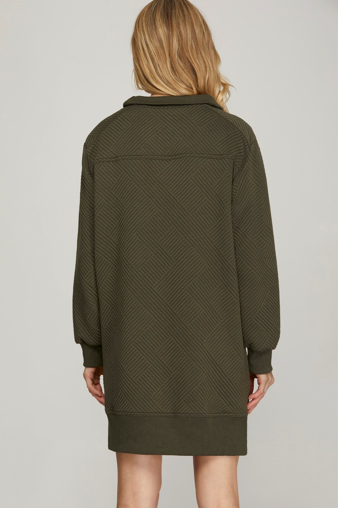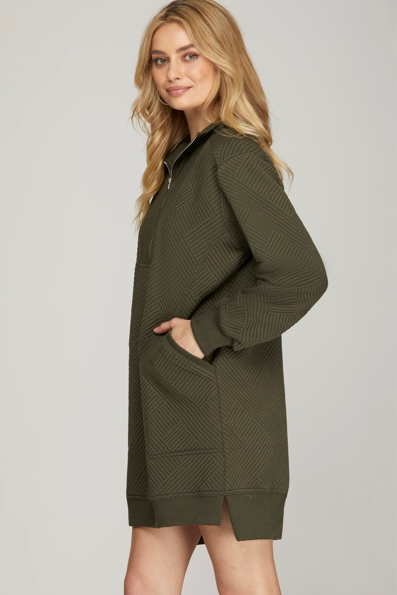 This heavy knit, long sleeve mini dress dress features a convenient half zip, pockets, and a fun textured pattern. Comes in a lovely olive color perfect for fall.