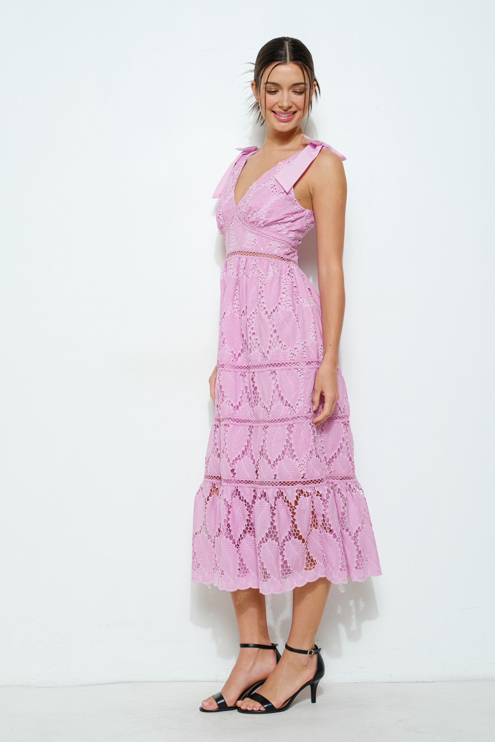 Embrace timeless elegance with this lace ribbon accent midi dress. Featuring a V-neckline with delicate ribbon accents on the shoulders, this dress stuns with its intricate leaf-pattern lace overlay. The fitted bodice and crochet waist trim enhance your silhouette, while the tiered A-line skirt adds graceful movement. Perfect for spring gatherings and garden parties, it’s finished with a hidden back zipper and hook-and-eye closure for a seamless fit.