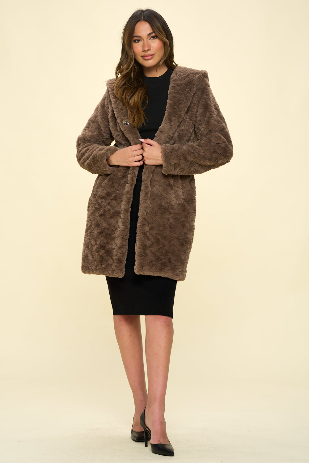 A gorgeous and classy button up hooded coat with pockets, made with a vegan friendly faux fur.