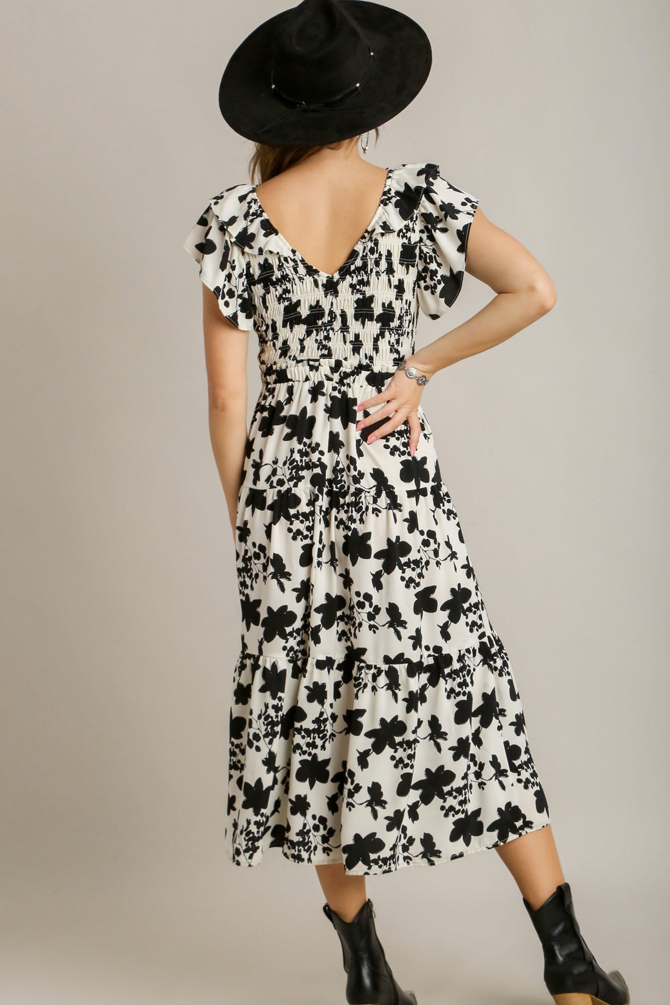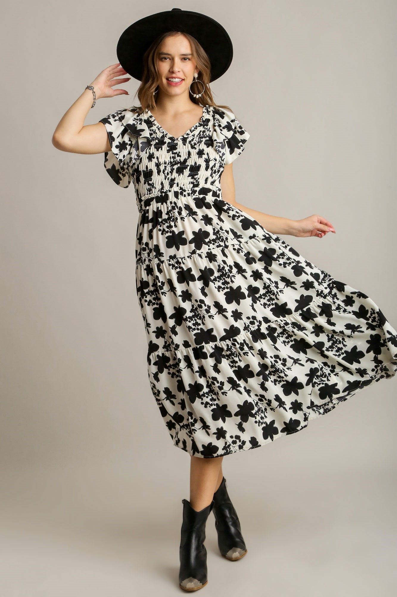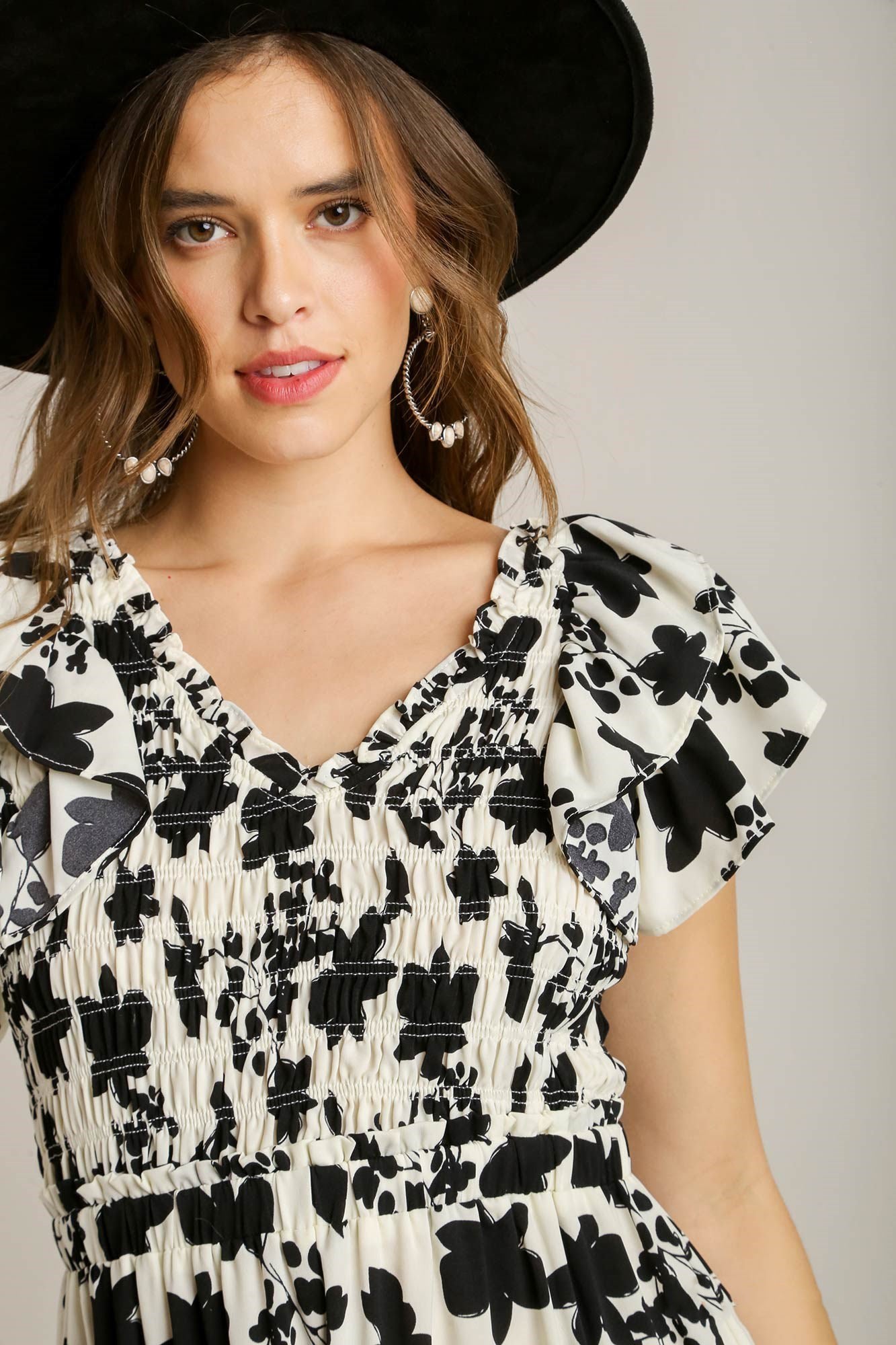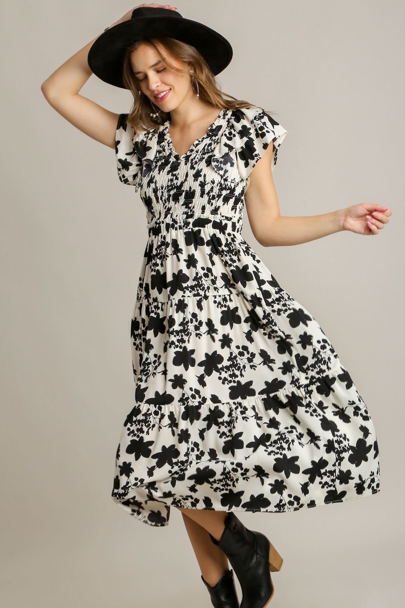 Effortlessly stylish - this floral printed V-neck dress features short sleeves and a smocked detailing for a flattering fit. Perfect for any occasion, from brunch to a night out.