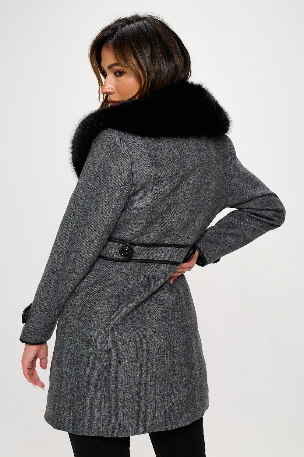 A classic and classy coat with a removable faux fur collar, button sleeve detailing, a cinched waist, back belt detailing, and side zipper pockets.