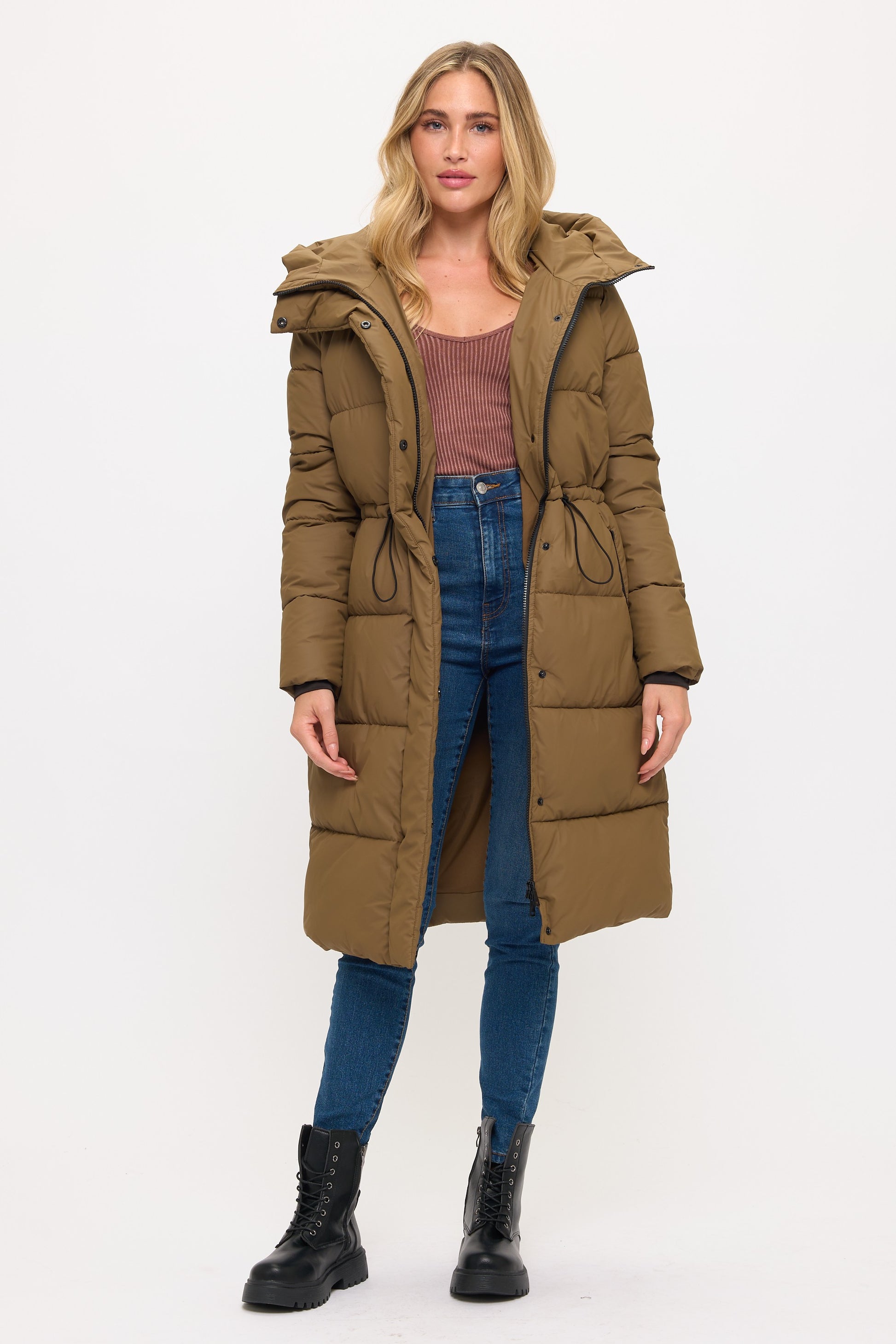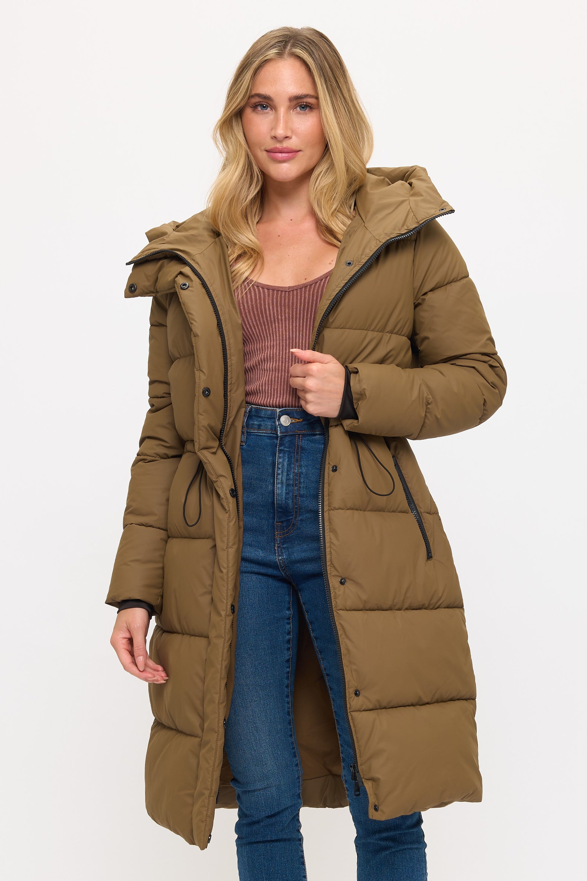 This hooded puffer coat combines warmth with a flattering silhouette, featuring a padded, quilted body and an adjustable cinched waist for a tailored fit. The roomy hood adds extra protection against the cold, making it both cozy and stylish for everyday winter wear.