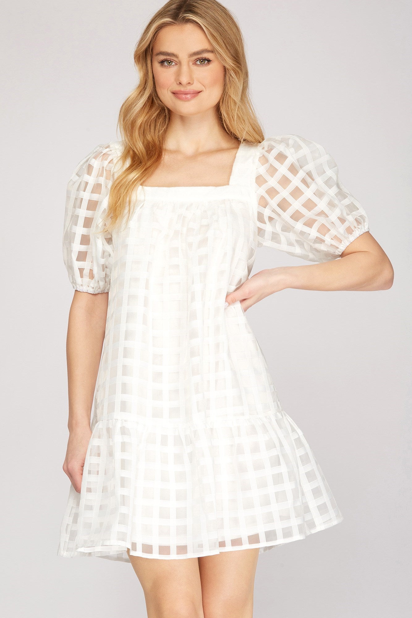 A chic and stylish short sleeve, white dress with a square neckline and grid pattern for added flair.