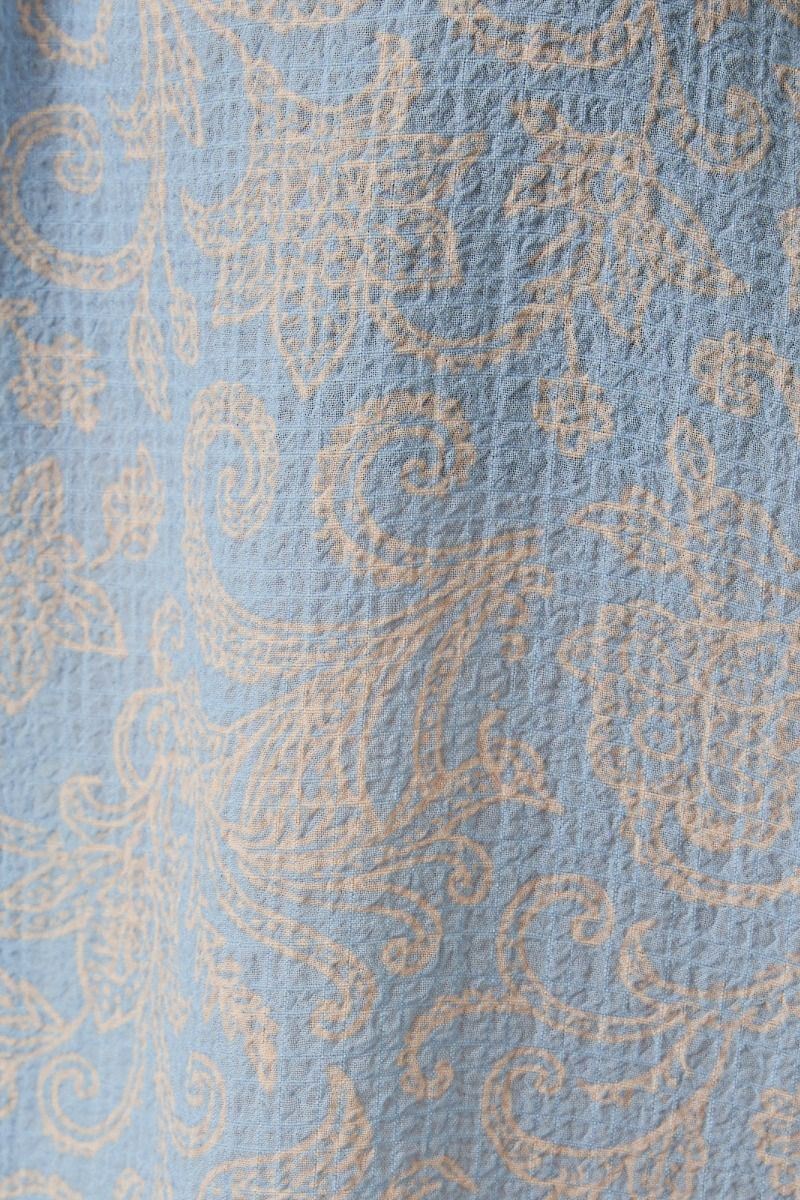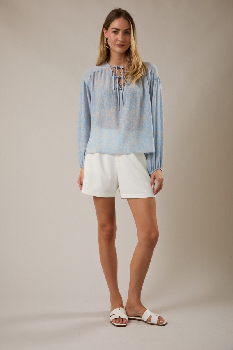 A lightweight long-sleeve top featuring a soft paisley pattern in a light blue and cream palette. Designed with a relaxed silhouette, gathered yoke detailing, and a tie-neck front that adds subtle shape and charm. Elastic cuff sleeves provide an easy, comfortable fit, making it a versatile piece for everyday wear with a polished feel.
