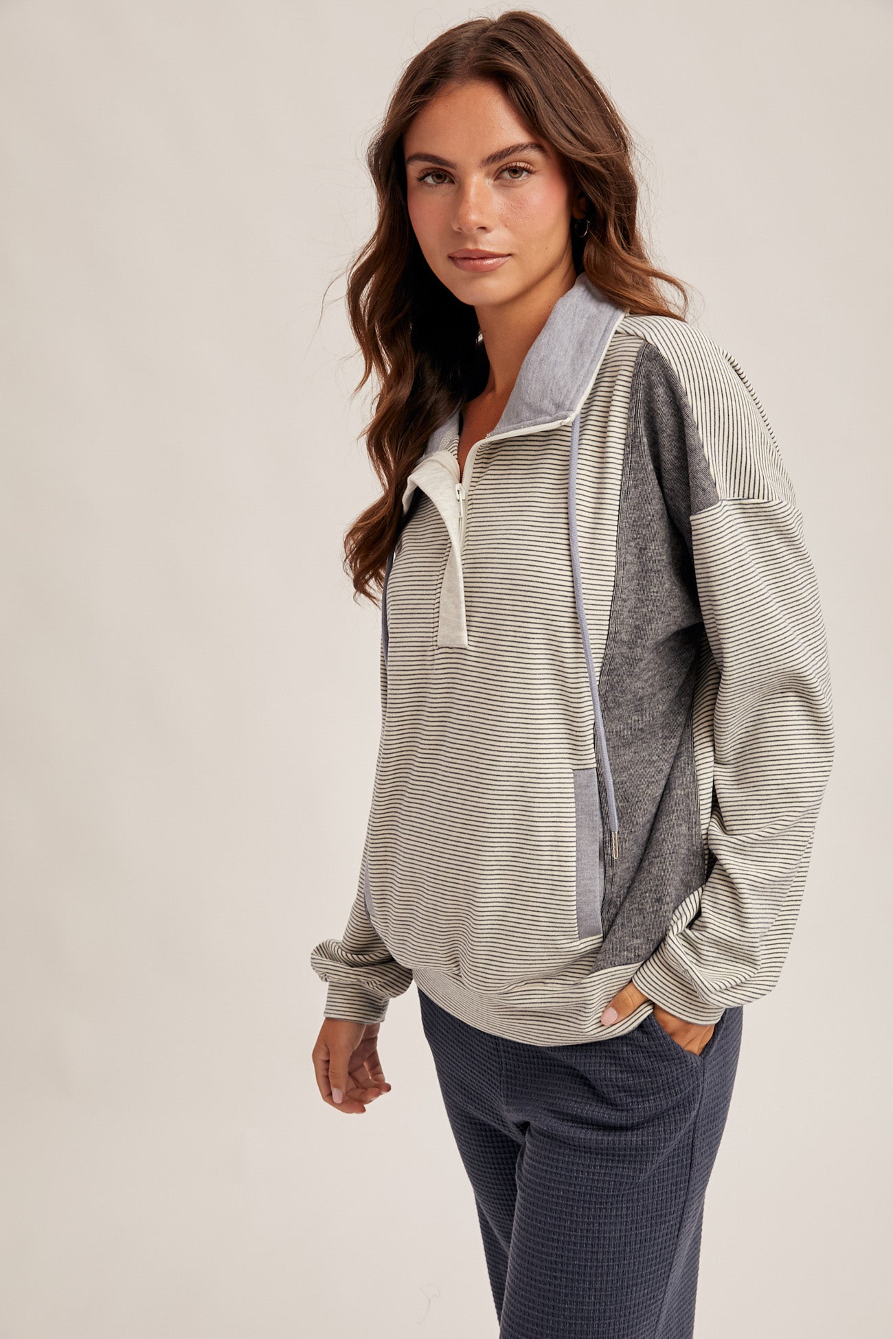 This quarter-zip pullover sweatshirt features a modern striped design with contrasting panels for a stylish, contemporary look. Soft brushed fabric and a relaxed fit offer comfort and ease, making it a versatile choice for casual wear or layering.