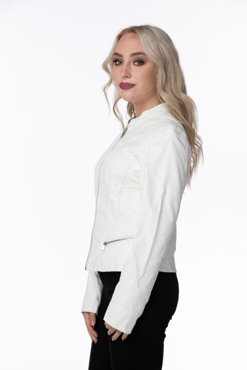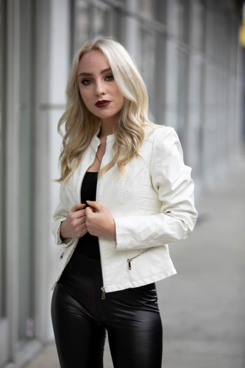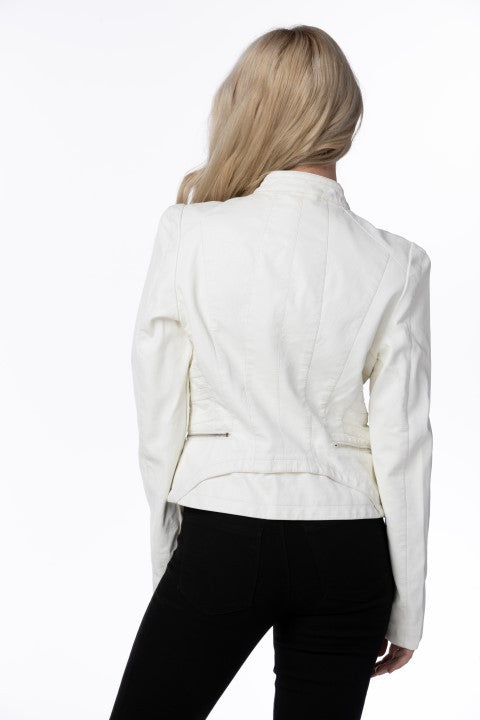A stylish zip up long sleeve lined jacket with decorative stitching and zip pockets made with vegan leather.