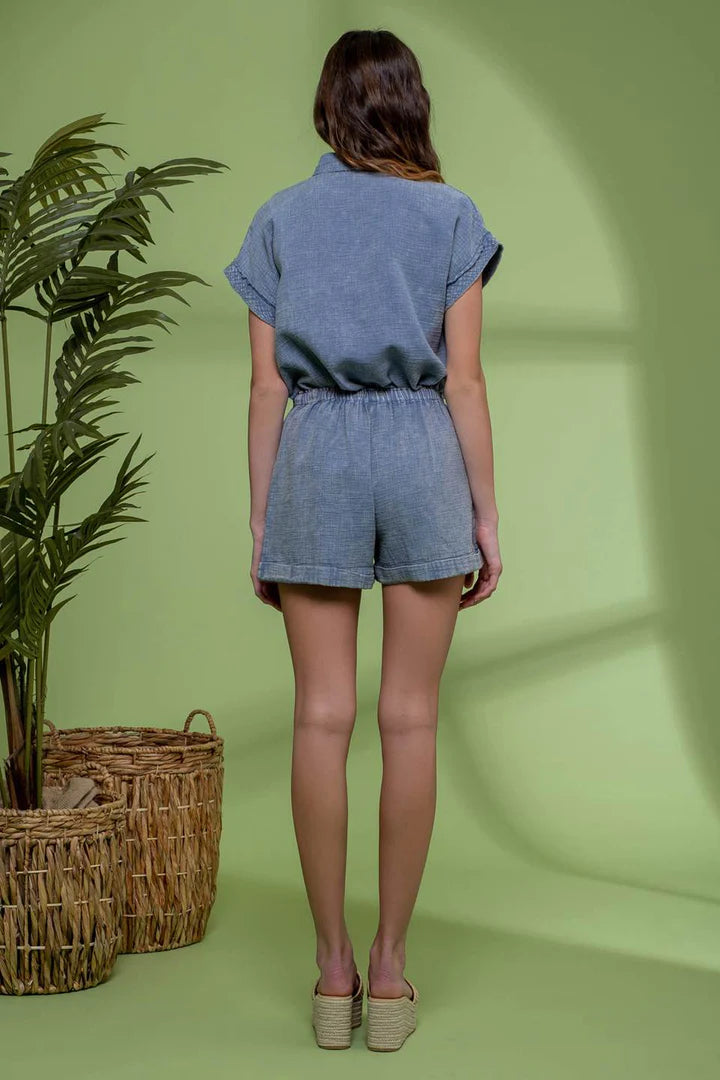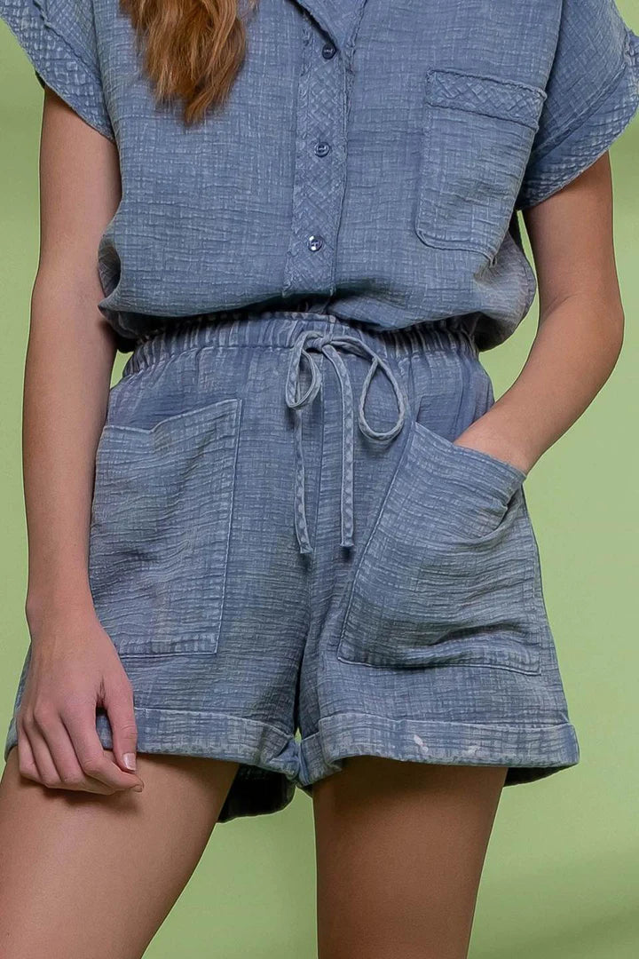 A classic pair of washed denim shorts, with an elasticized drawstring waist, pockets, a rolled up hem, and a relaxed fit.