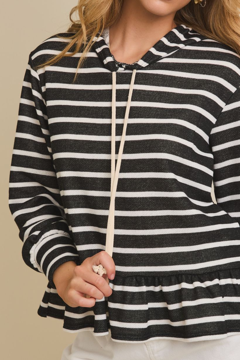 Laid-back meets playful in this lightweight black and white striped hoodie. Designed with long sleeves, a functional drawstring hood, and a flirty ruffle hem, it adds a fun twist to your everyday layers.