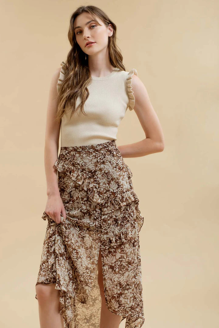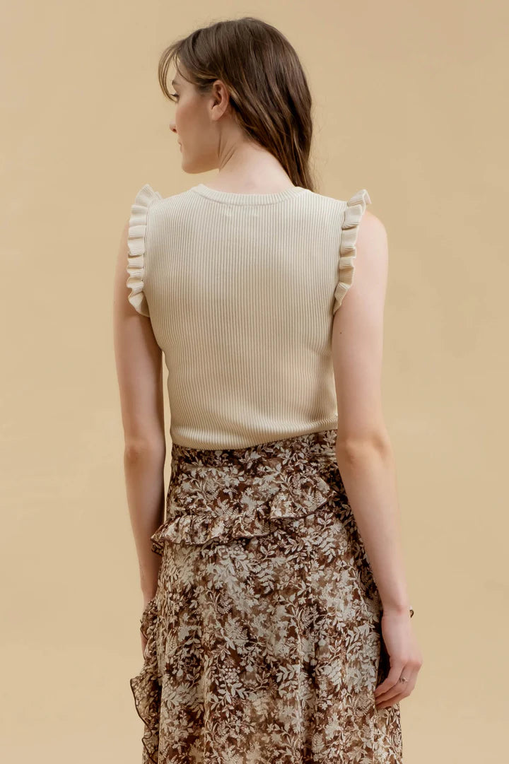 Featuring a round neckline and sleeveless design, this fitted knit top stands out with its playful ruffle shoulder detail. Perfect for any occasion, this solid tank is sure to make a statement and show off your unique style.
