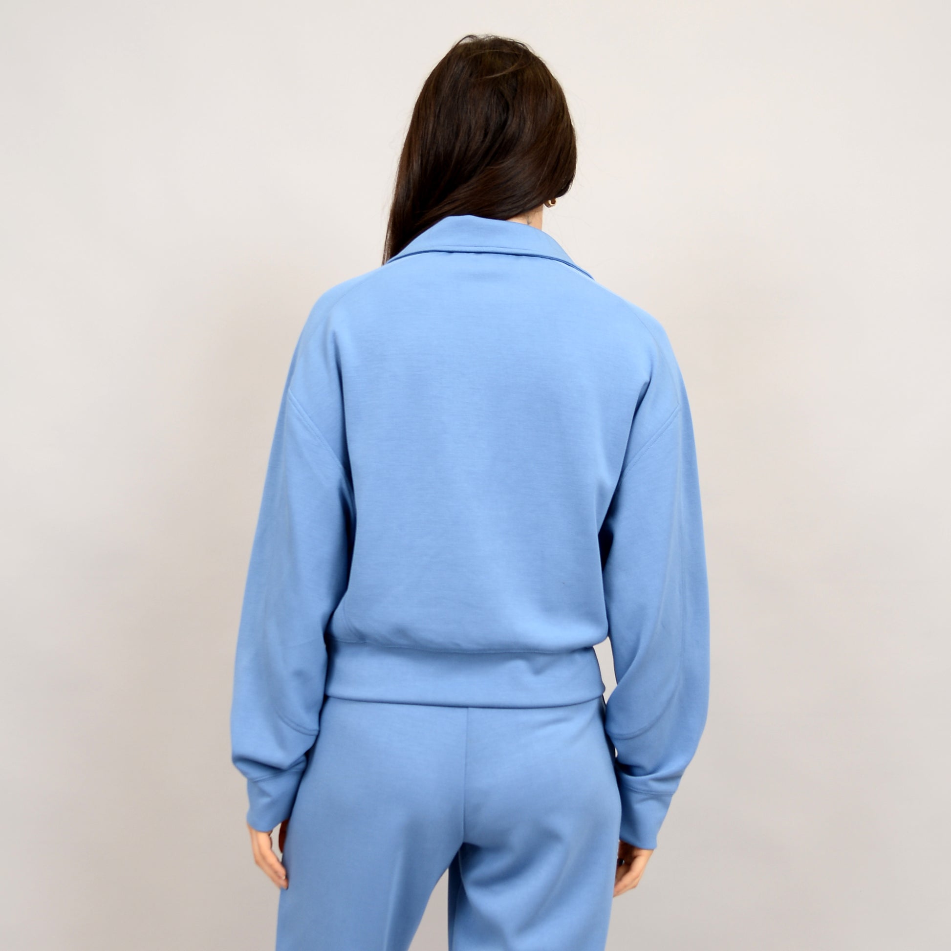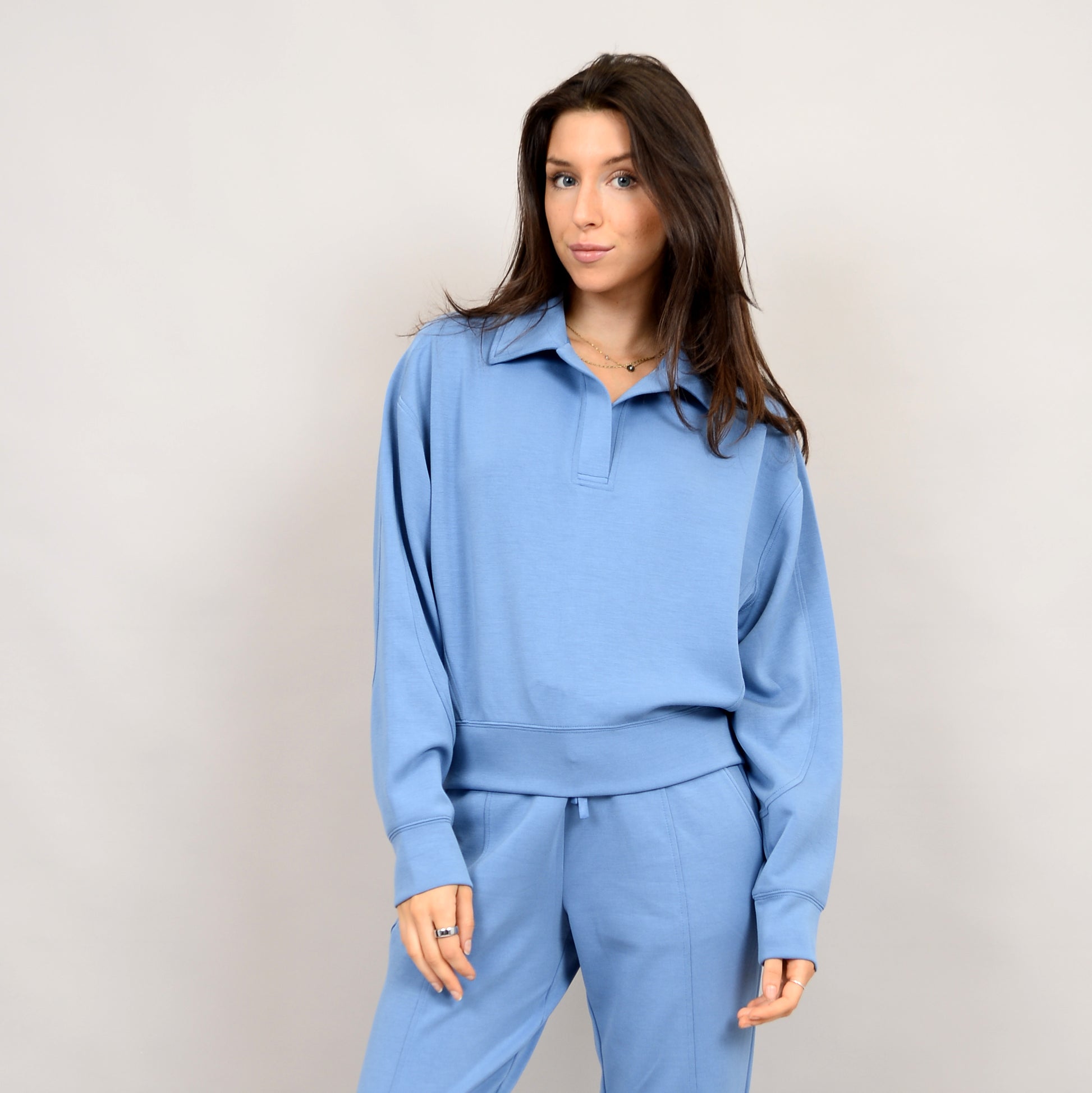This cozy, long-sleeved pullover features a stylish Johnny collar and comes in a beautiful slate blue color. Perfect for chilly days and nights, this sweater is both comfortable, with its scuba fabric, and fashionable.
