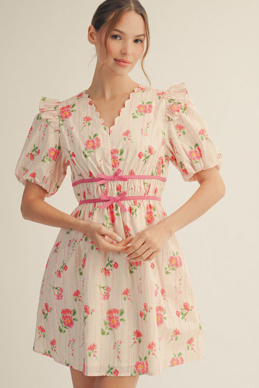 Soft and romantic, this floral mini dress features a scalloped V-neckline and delicate ruffle shoulder accents for a feminine touch. The empire waist is highlighted by a contrast ribbon tie that creates a flattering, gently gathered silhouette. Short puff sleeves and a lightweight feel make it perfect for warm days, brunch dates, or garden parties. A subtle striped background paired with a pink, rose floral print adds charm and vintage-inspired detail.