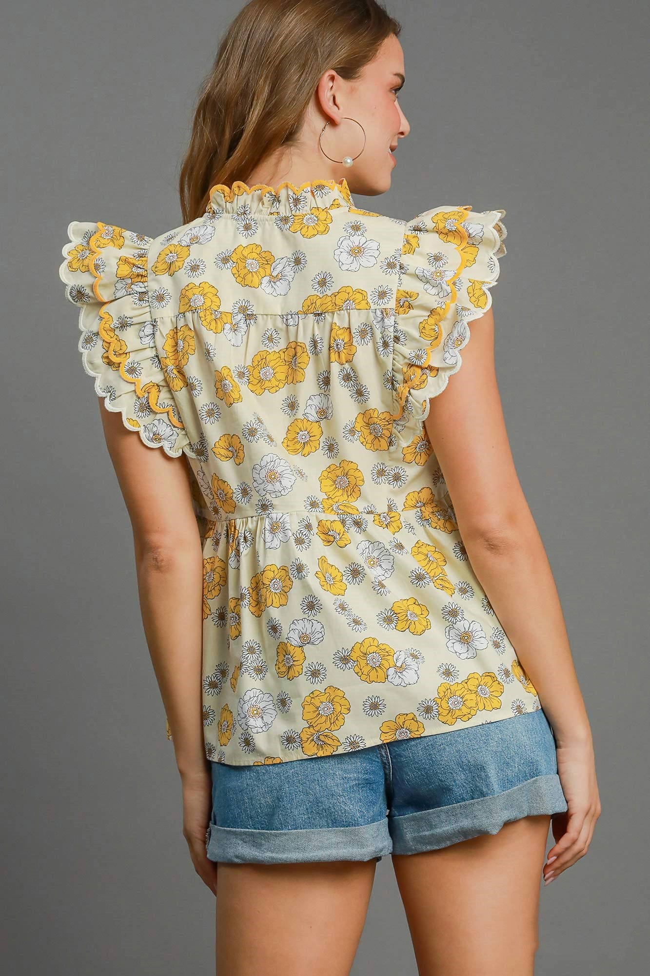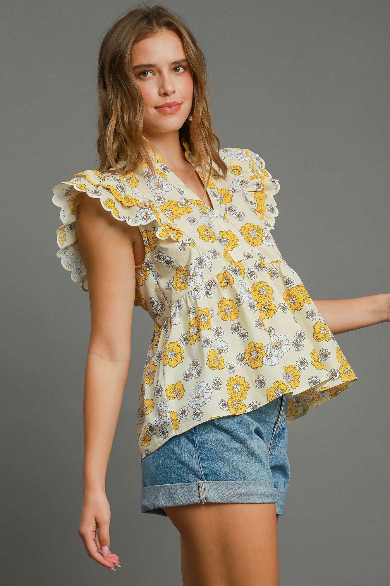 Spruce up your wardrobe with our Floral Print Peplum Top! The scalloped sleeves add a playful touch while the peplum silhouette flatters your figure. Stay comfortable and stylish with the added benefit of it being fully lined. Perfect for any occasion!