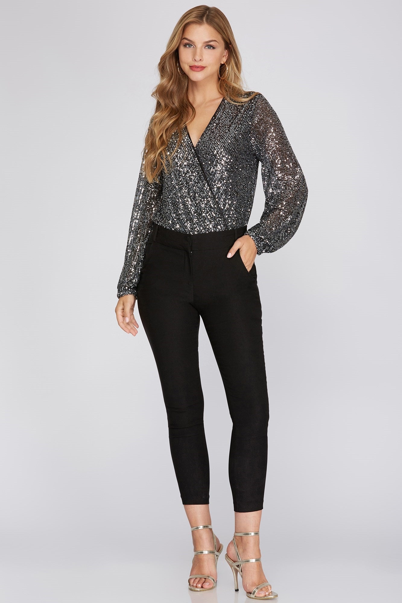 A gorgeous and super chic long sleeve bodysuit with silver and black sequins to dazzle and delight.