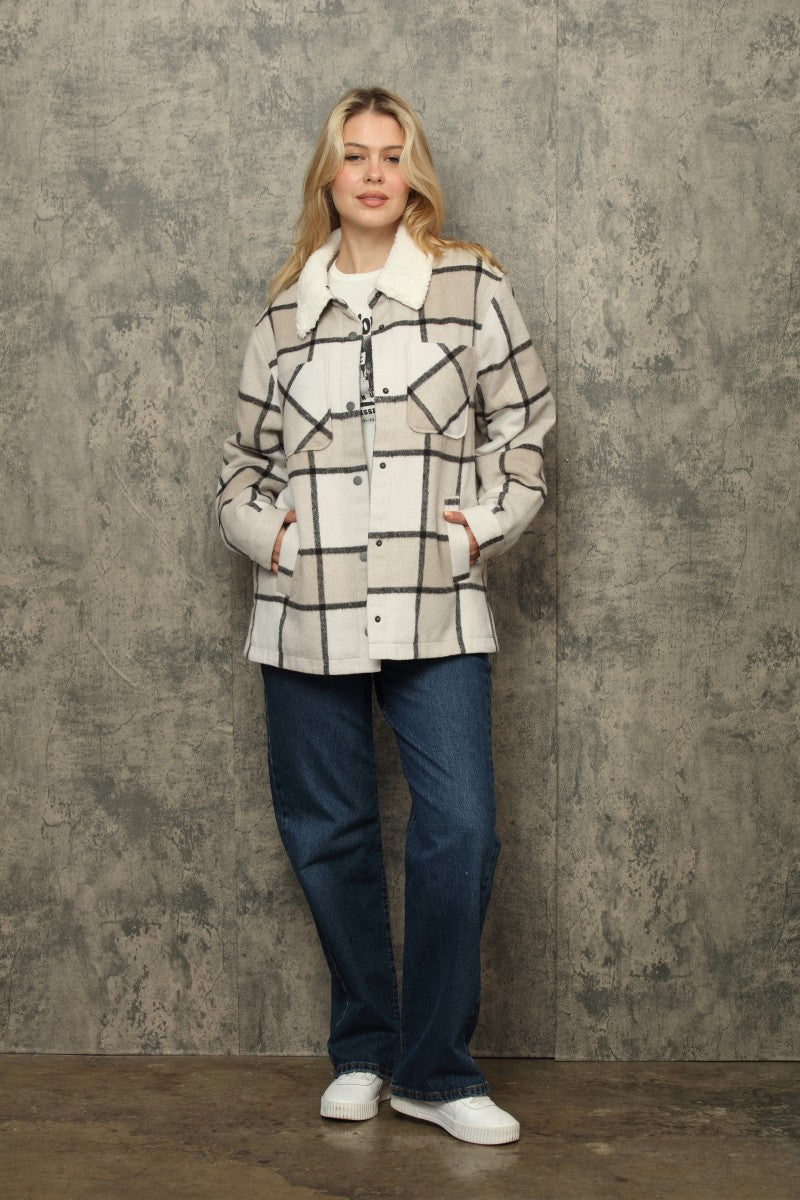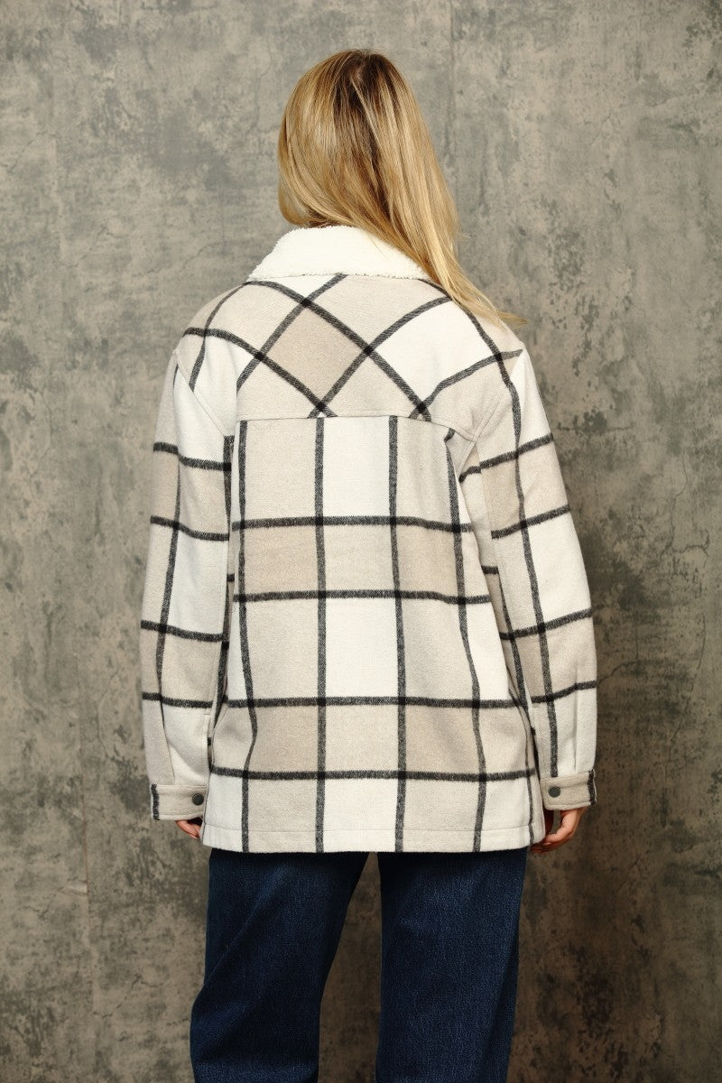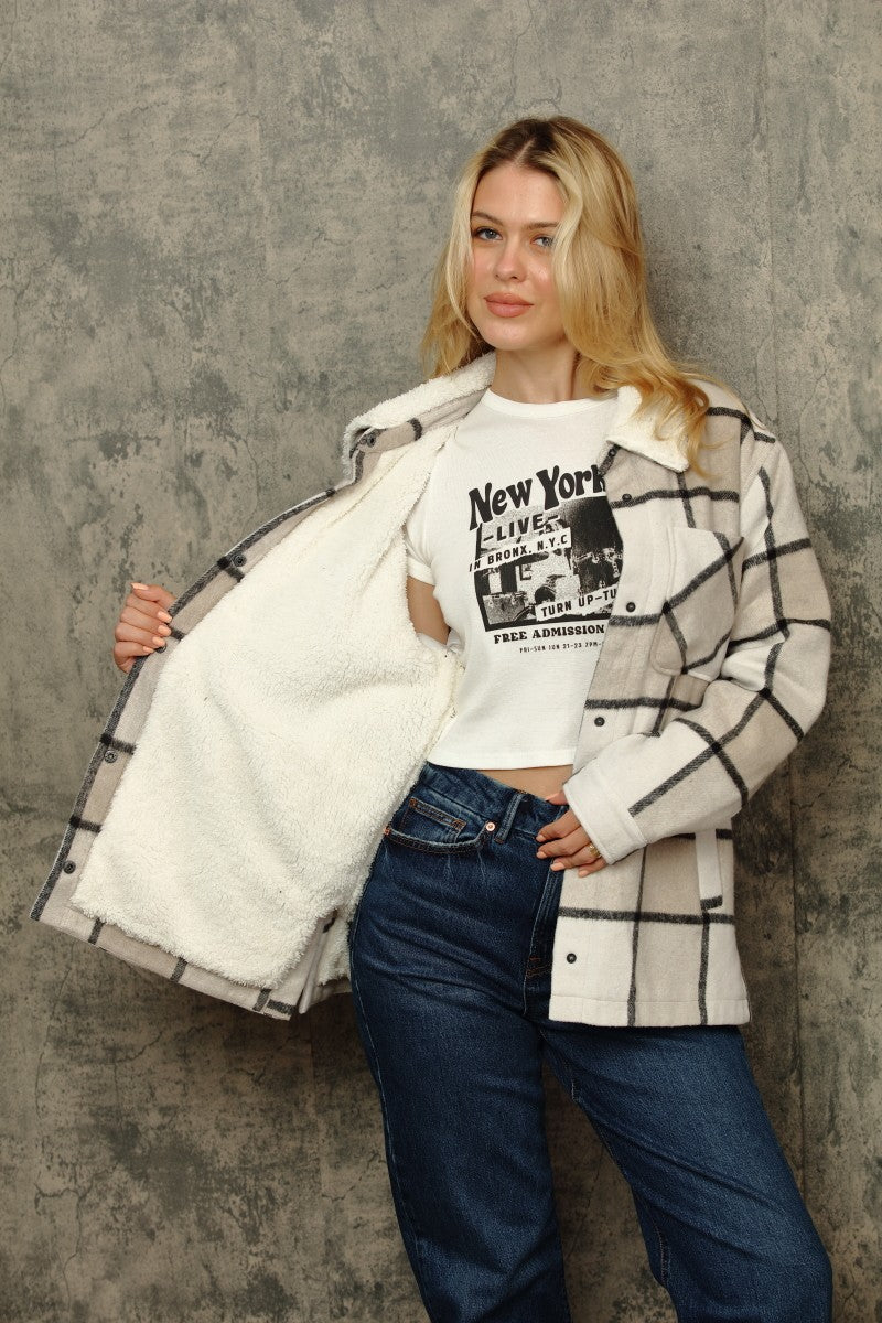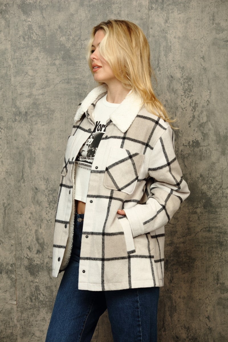 This flannel plaid shacket with Sherpa lining is the perfect blend of cozy comfort and timeless style. Made from heavy flannel fabric with a classic plaid print, this shacket is designed for layering. The soft Sherpa lining adds extra warmth, while the snap button closure and four functional pockets bring both practicality and rugged charm. A versatile jacket-shirt hybrid, it’s ideal for casual outings, cool-weather layering, or adding a laid-back edge to everyday looks.