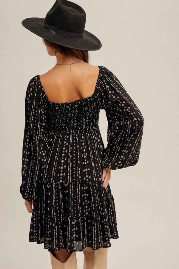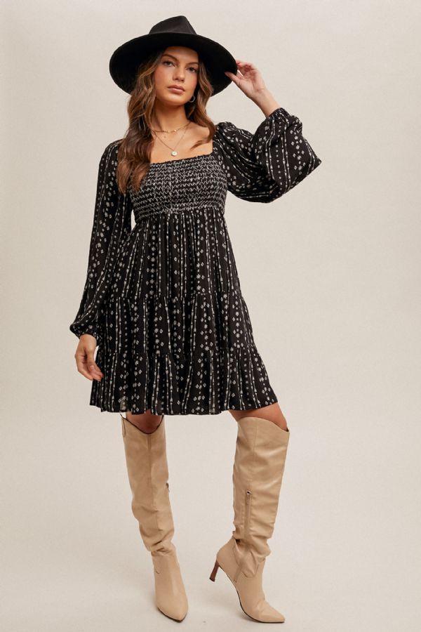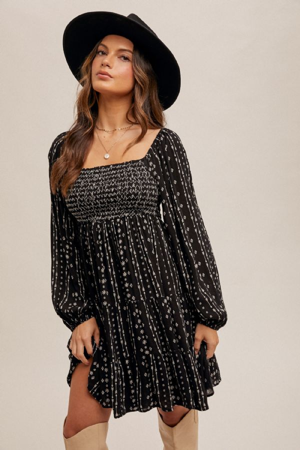 This playful dress features smocking detail, long bubble sleeves, and a fun, unique printed design. Comes in a black and white mix.