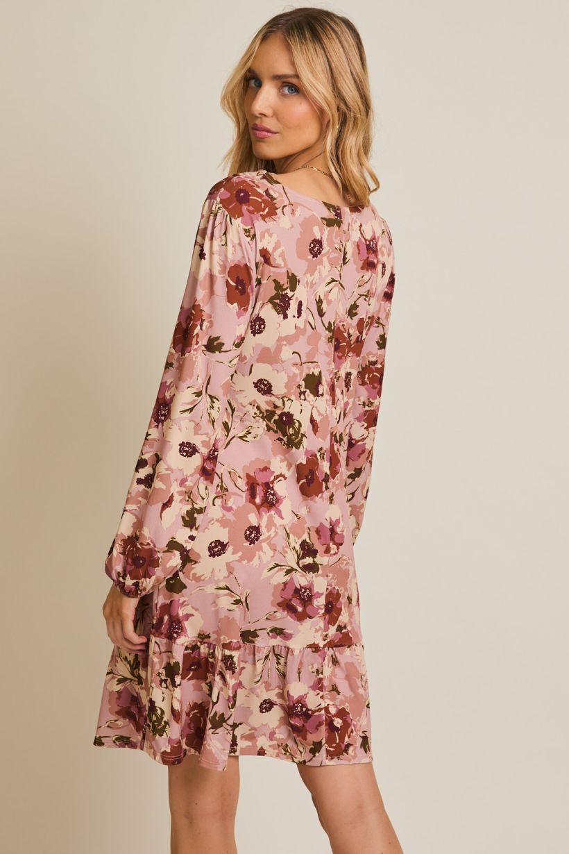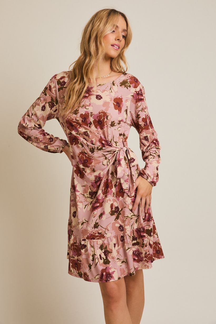 Elegant with a touch of charm, this floral dress features a classic round neckline, long sleeves, and a flattering side tie detail that cinches the waist just right. The soft floral print and easy silhouette make it perfect for day-to-night styling.