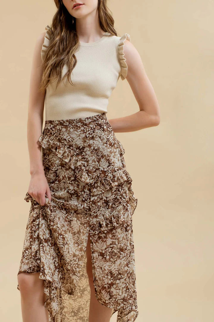 With a high waist, invisible zipper, and ruffle wrap detail, this midi skirt is both stylish and practical. The split thigh and handkerchief hem add a touch of flirty fun to this floral print piece. Plus, it's lined for added comfort!