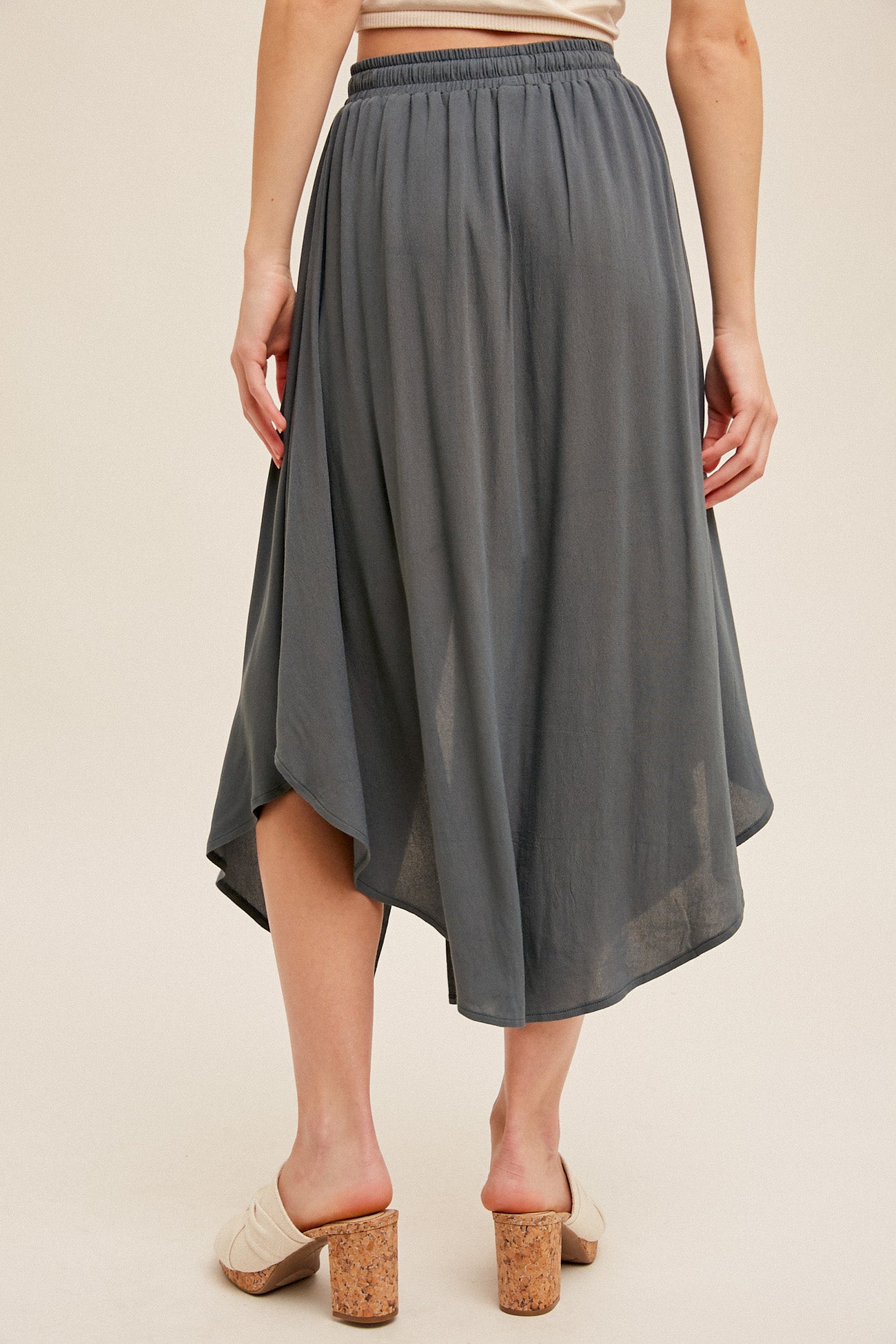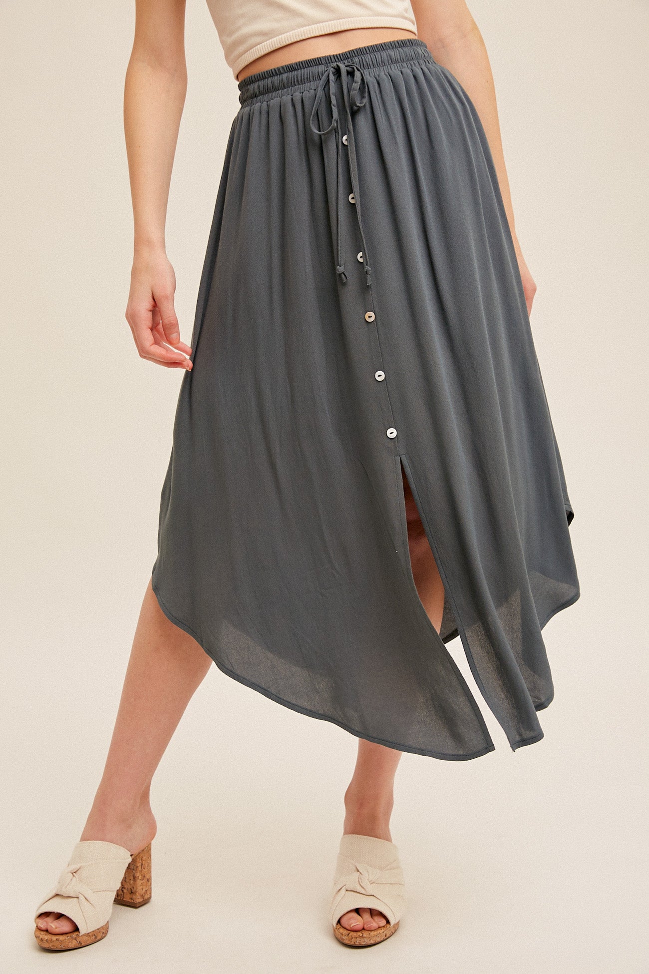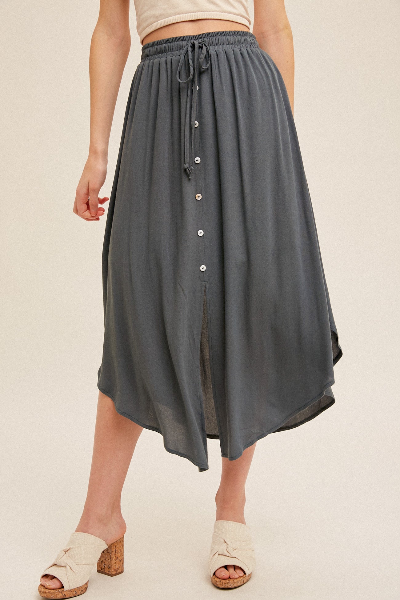 The button detailing, stretchy waistband with drawstring, and scoop hem give this skirt a unique twist. Plus, with a built-in lining, you can feel confident and comfortable all day long. Perfect for any occasion - it's a must-have for your wardrobe!