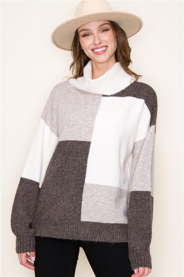 A fun and stylish turtleneck with a slouchy, casual touch and a color block pattern done in neutral colors.