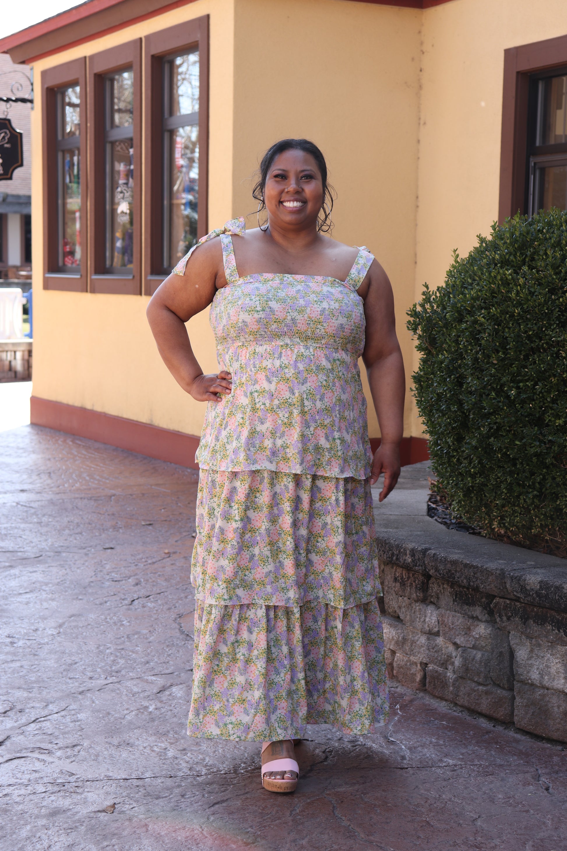 Get ready to bloom in our new dress! The playful tie straps add a pop of fun while the smocked design offers a comfortable, flattering fit. With a beautiful yellow floral print, this dress is perfect for any sunny day.