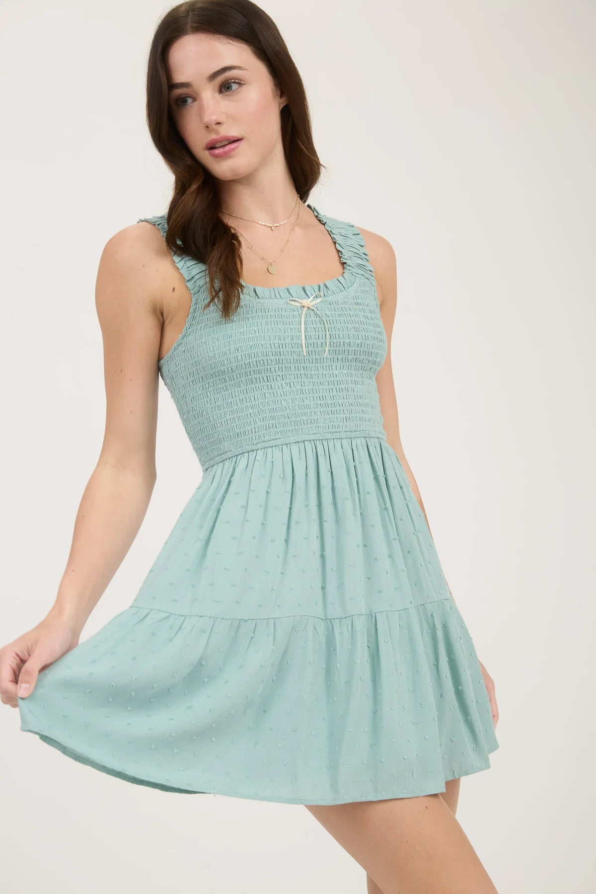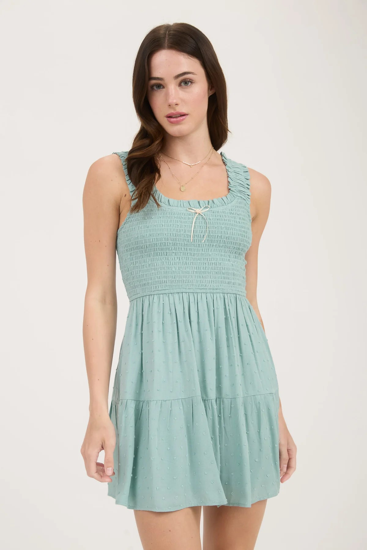 Sweet, flirty, and full of charm—this sleeveless mini dress is made for sunny days and special moments. Designed with a feminine scoop neckline and delicate bow detail, it features elastic straps trimmed with soft ruffles for a playful touch. The breezy A-line silhouette flatters with ease, while the textured clip dot pattern adds subtle dimension. Fully lined for comfort, this mini is your go-to for everything from brunch dates to garden parties.