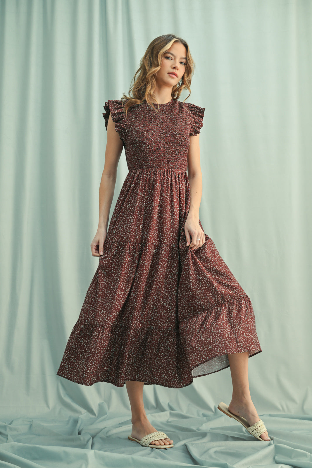 This floral ruffle sleeve midi dress brings a playful charm to your wardrobe with its smocked bodice that hugs comfortably and side pockets for a touch of practicality. Perfect for sunny days or casual outings, it combines feminine details with easygoing style.