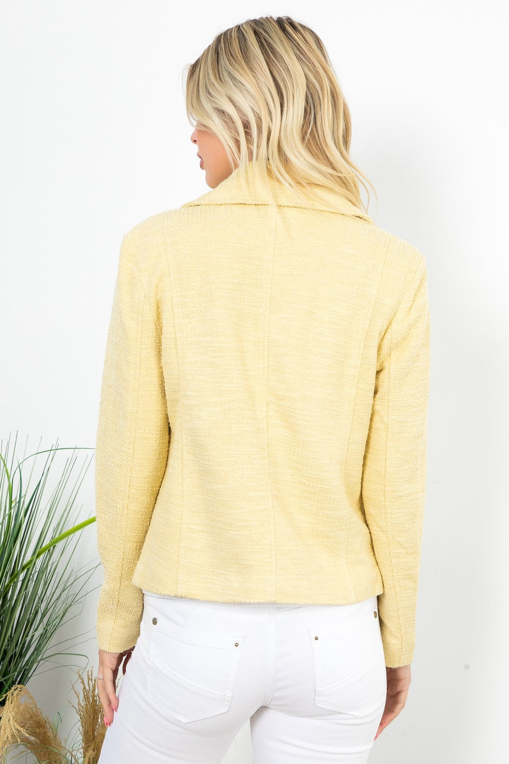 A fresh twist on a classic silhouette, this moto jacket is crafted from textured boucle fabric for a refined yet edgy look. With clean lines and functional zippers, it’s the perfect lightweight layer for transitional weather.