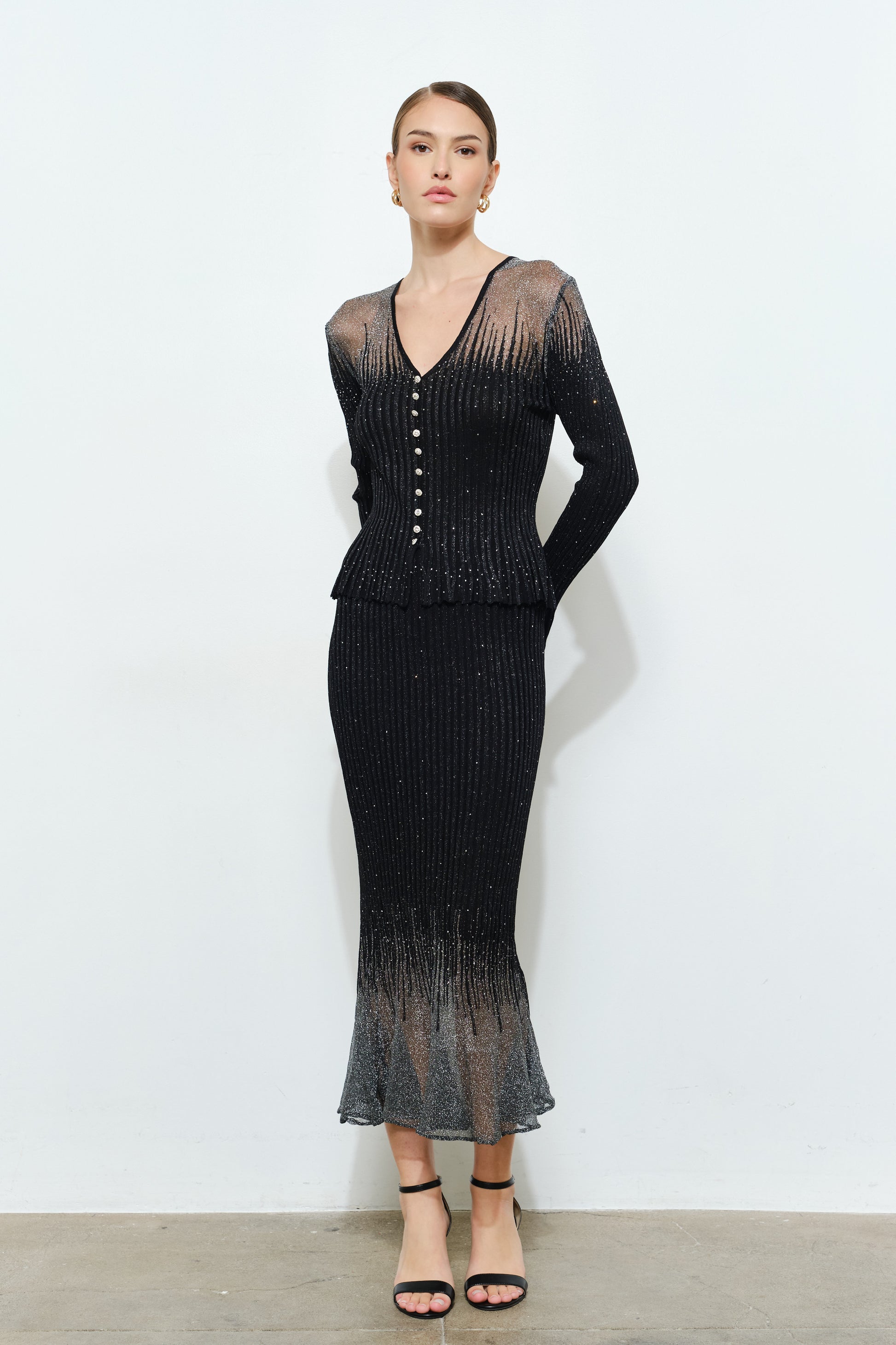 Shimmer with subtle sophistication in this metallic lurex midi skirt, detailed with sparkling hotfix embellishments and a sheer hem accent. The comfortable fit and fluid drape create an easy, flattering silhouette that moves beautifully. Perfect for evenings out or festive occasions, it brings a touch of understated glamour to any look.