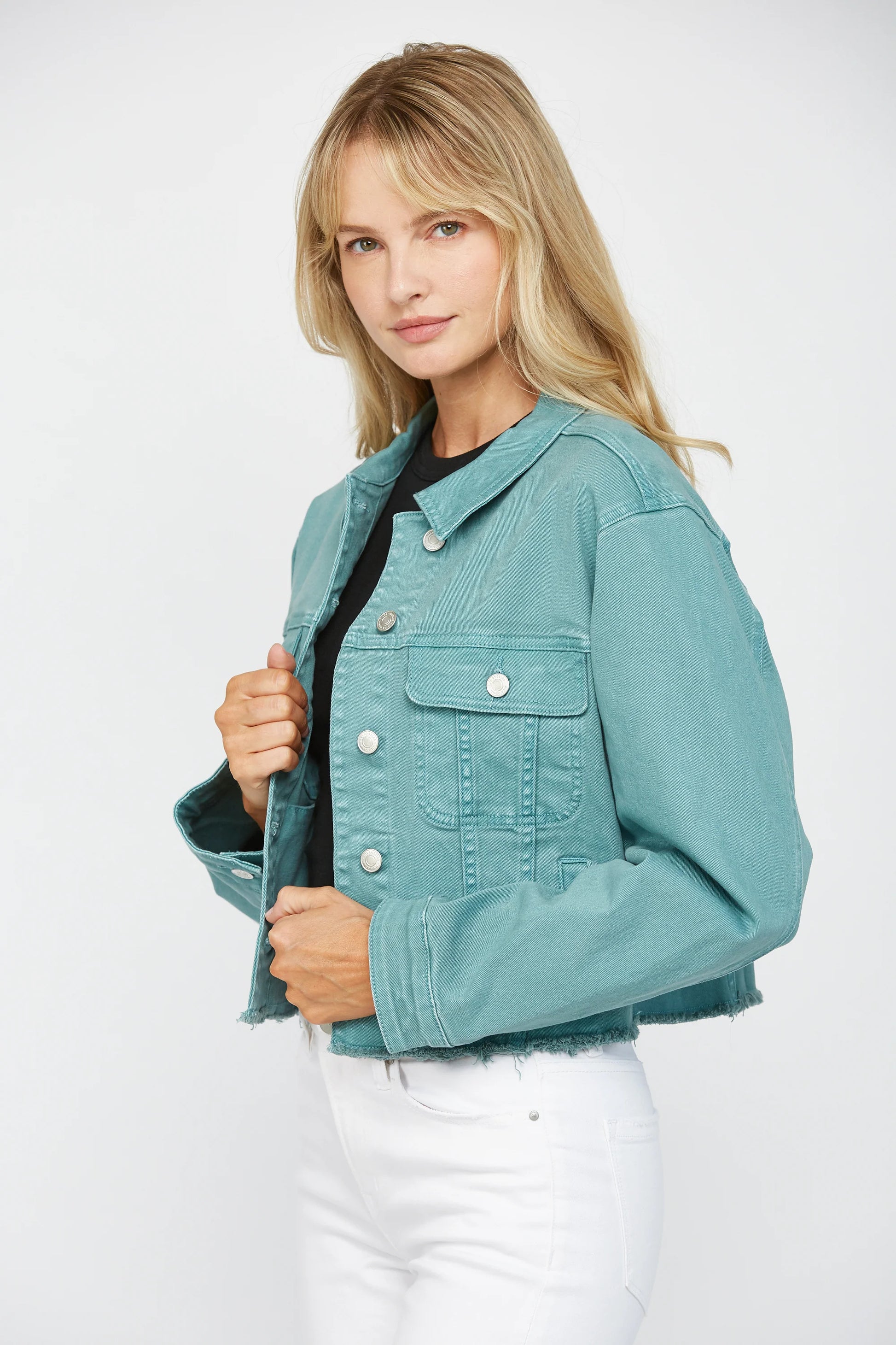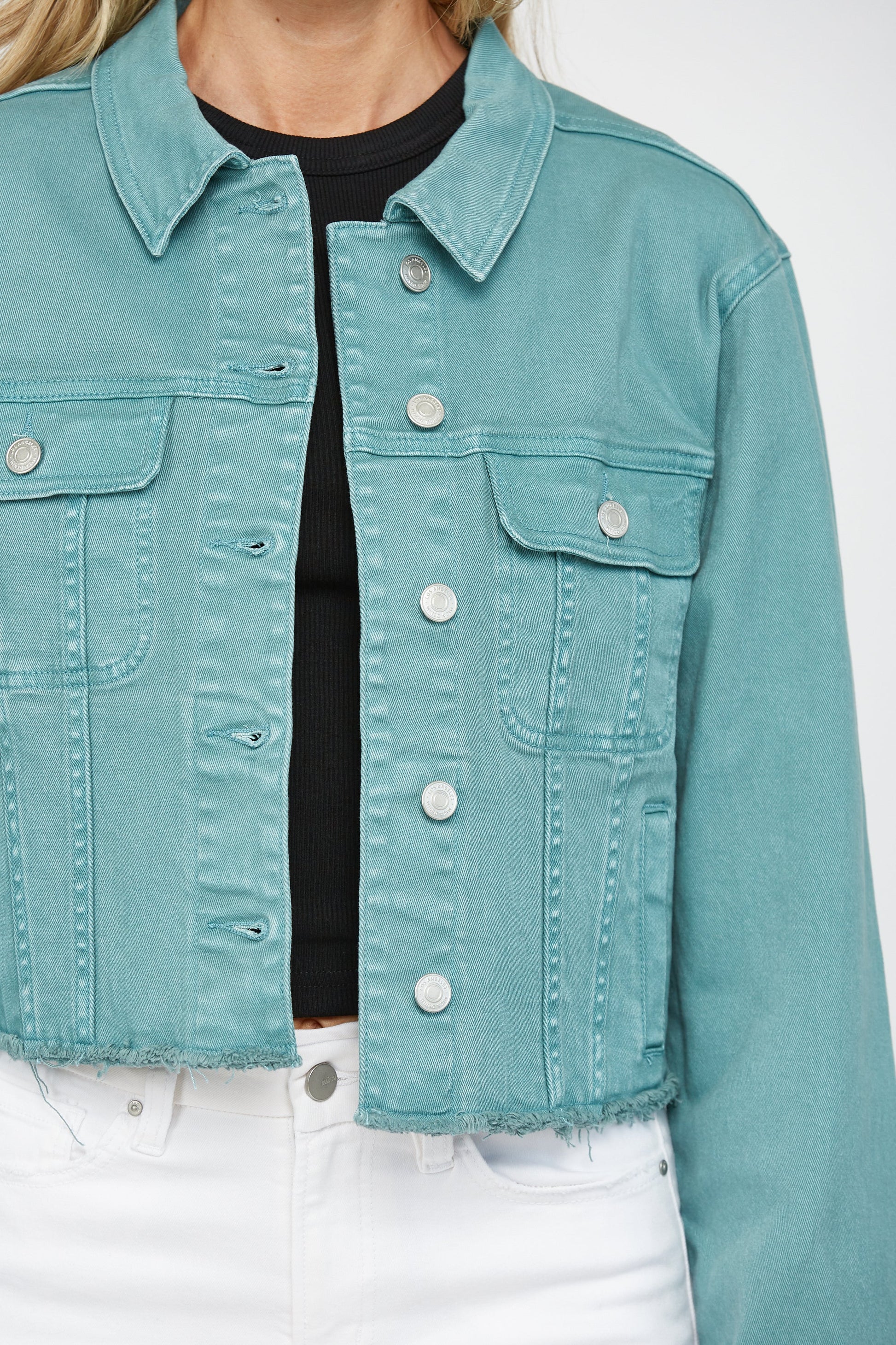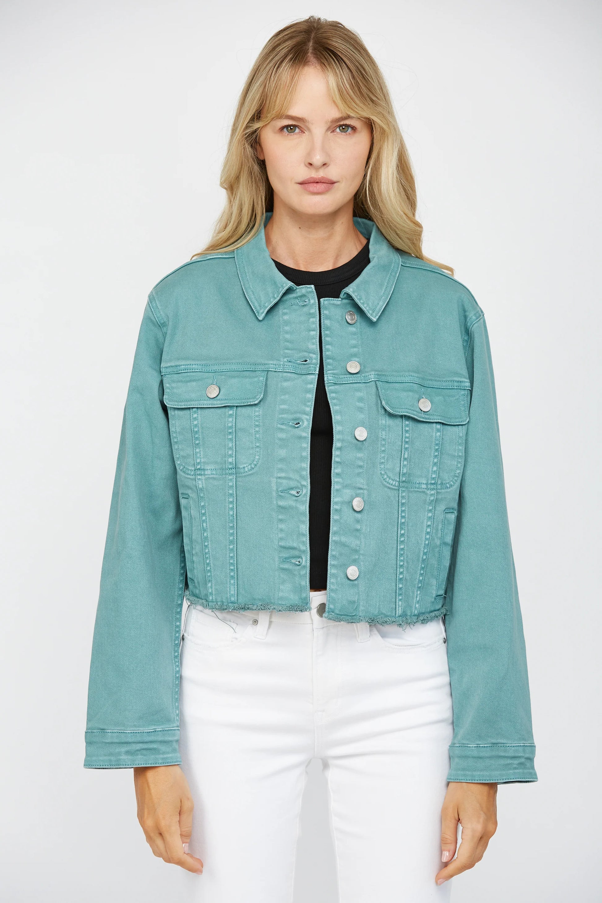 Add a pop of color to your wardrobe with this teal stretch denim jacket! Featuring a flexible fit, two front pockets, and a frayed hem for a touch of edge, it’s perfect for layering. A versatile must-have for any season!