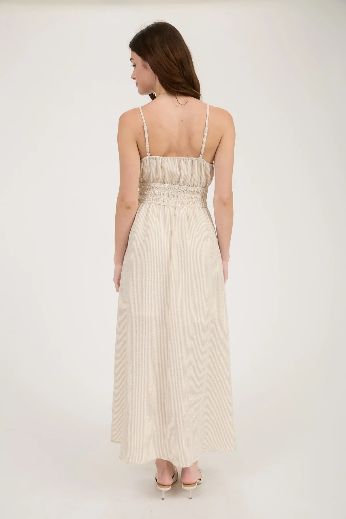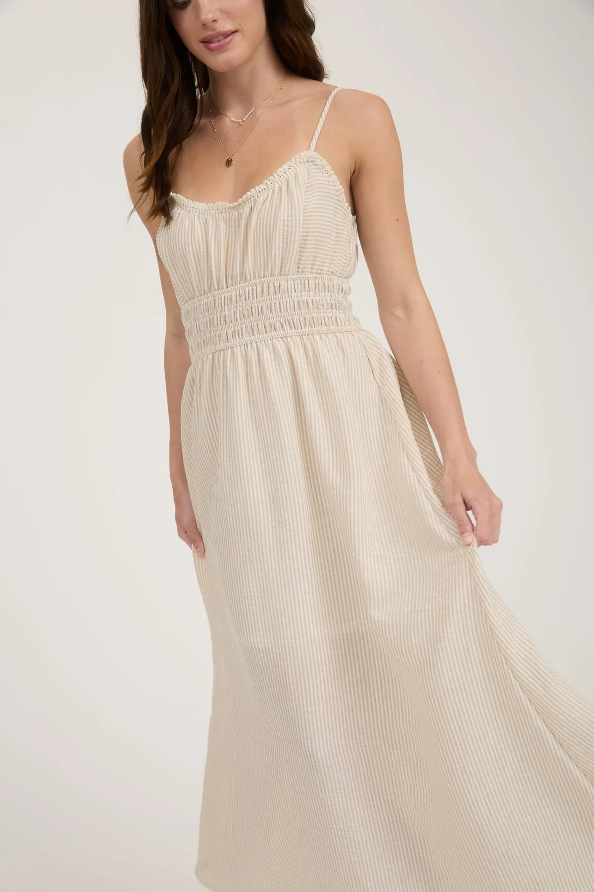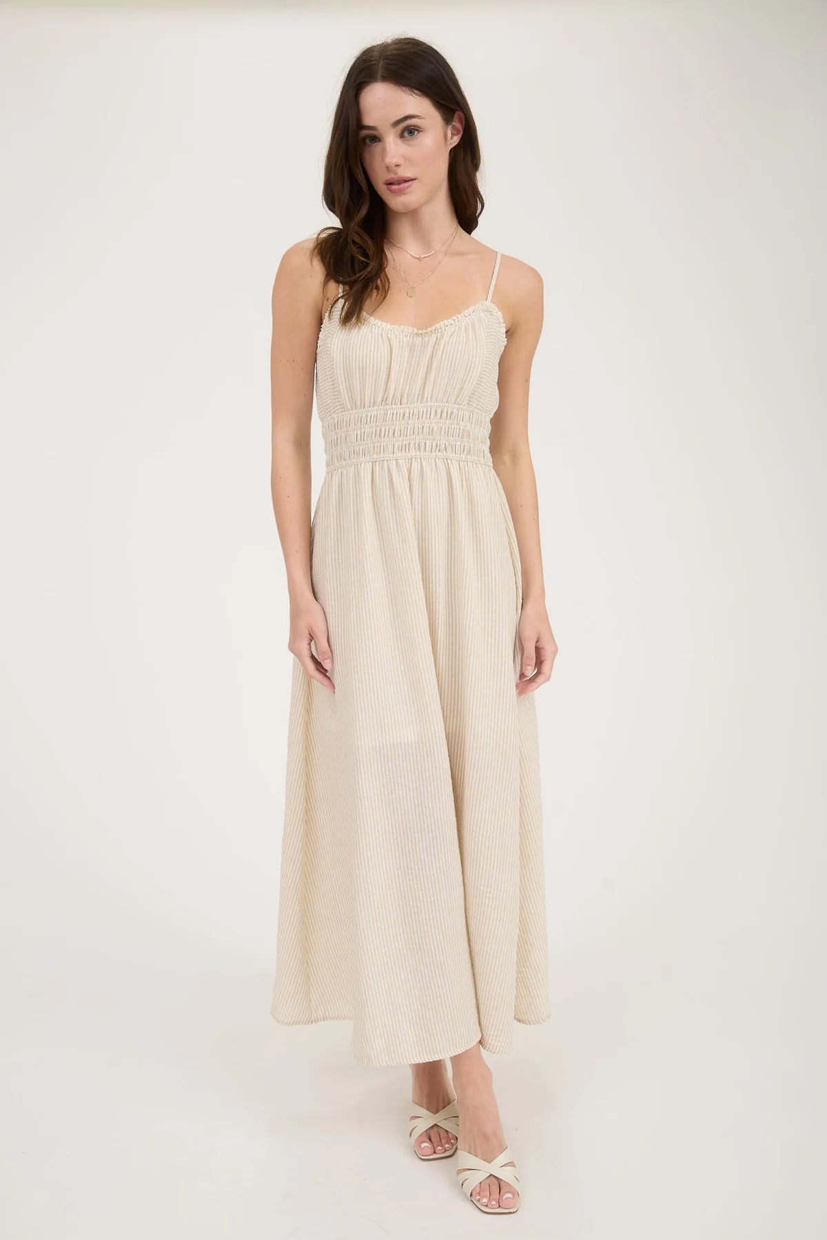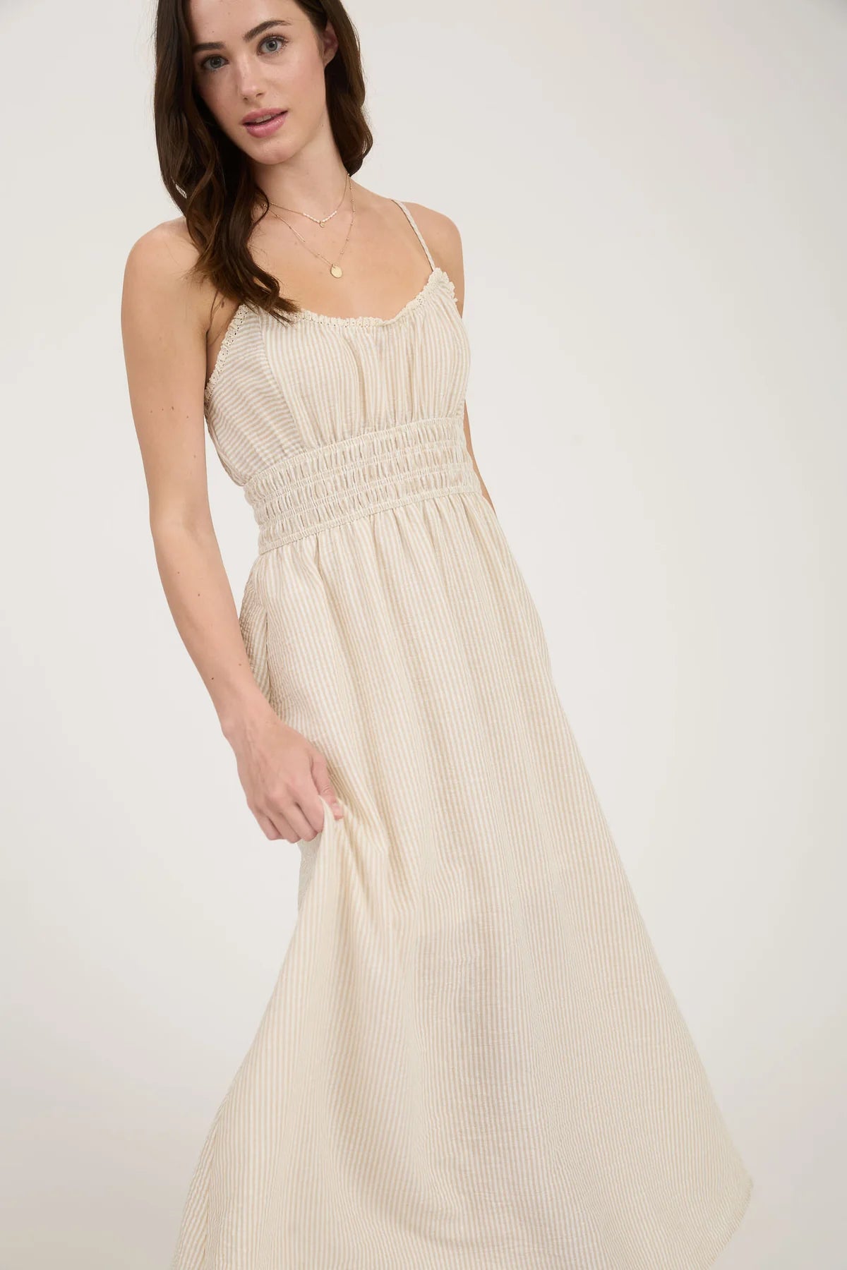 Turn heads in this ultra-stylish maxi dress. With adjustable spaghetti straps, delicate lace trim, and a flattering A-line silhouette, this dress is perfect for any occasion. The shirred elasticized waist and playful stripe pattern add a touch of fun to your wardrobe. Get ready to make a statement! Comes in a Khaki color.