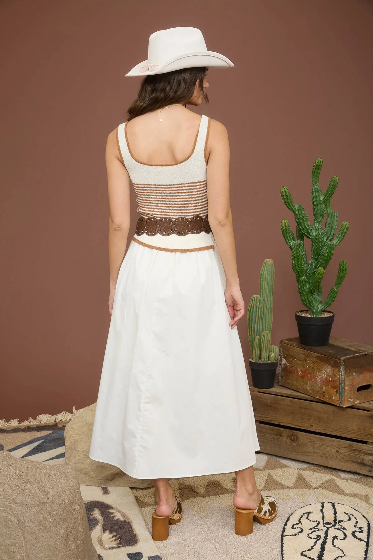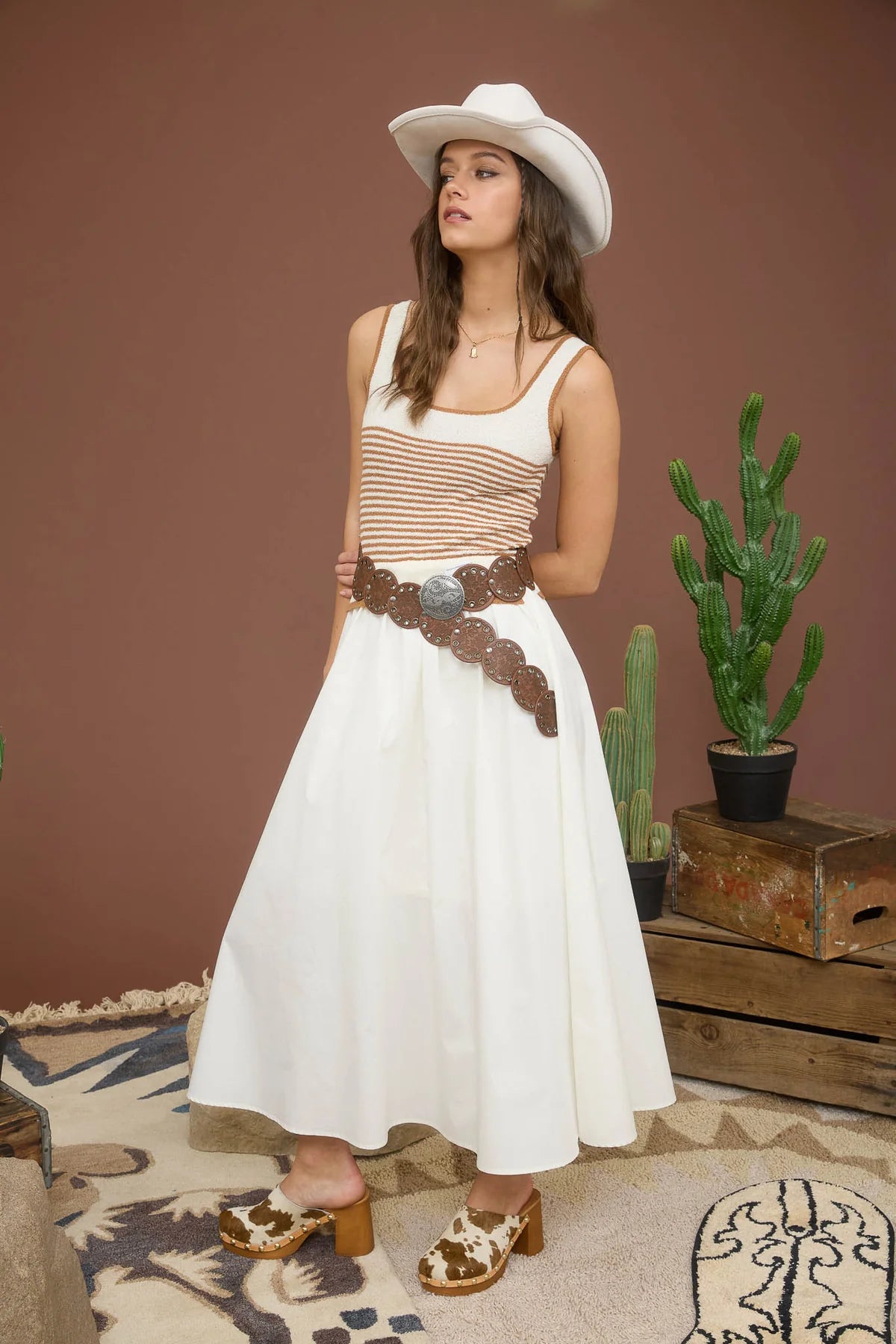 A fresh take on mixed textures, this midi dress pairs a soft, stripe sweater-knit tank bodice with a flowy woven A-line skirt. The scoop neckline and sleeveless cut keep it effortlessly cool, while the side slit adds a hint of movement. Fully lined for comfort, this mix media dress blends casual and refined—perfect for warm days when you still want to feel put together.