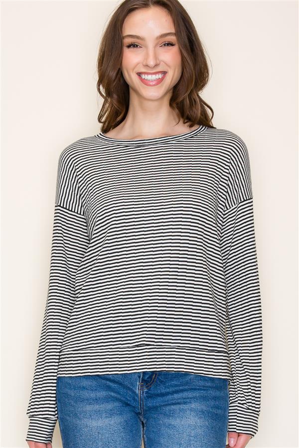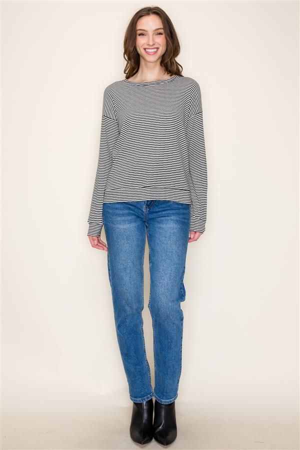 The playful textured striped pattern and wide neck add a touch of whimsy to this long-sleeved pullover top.