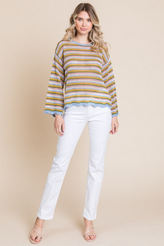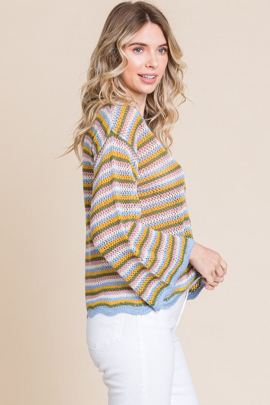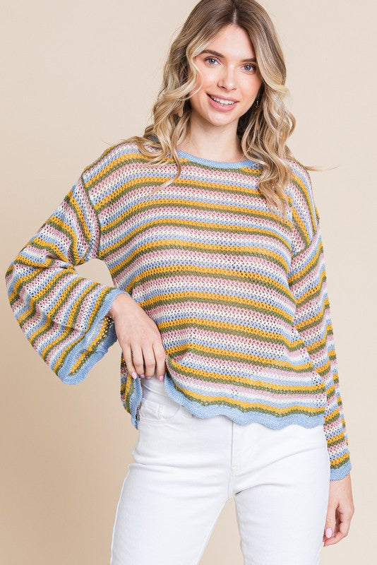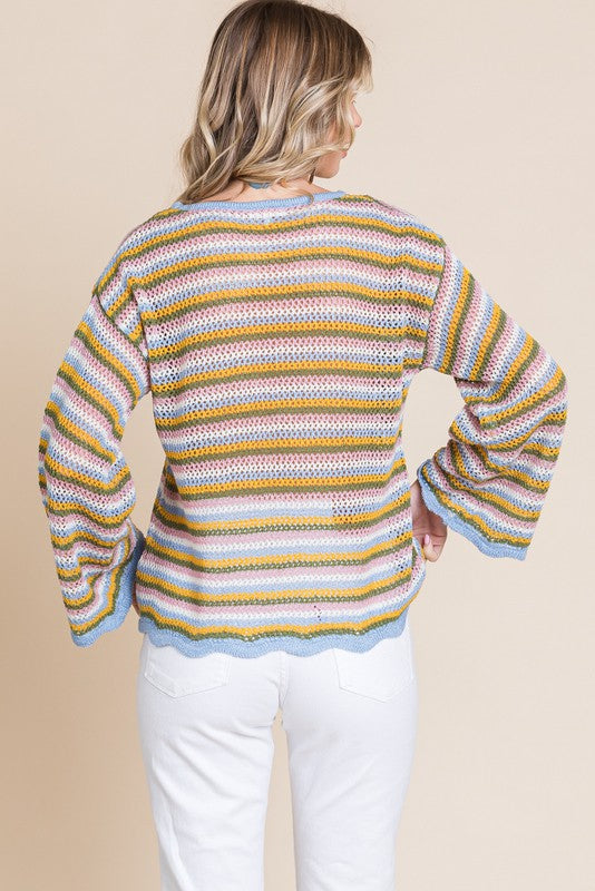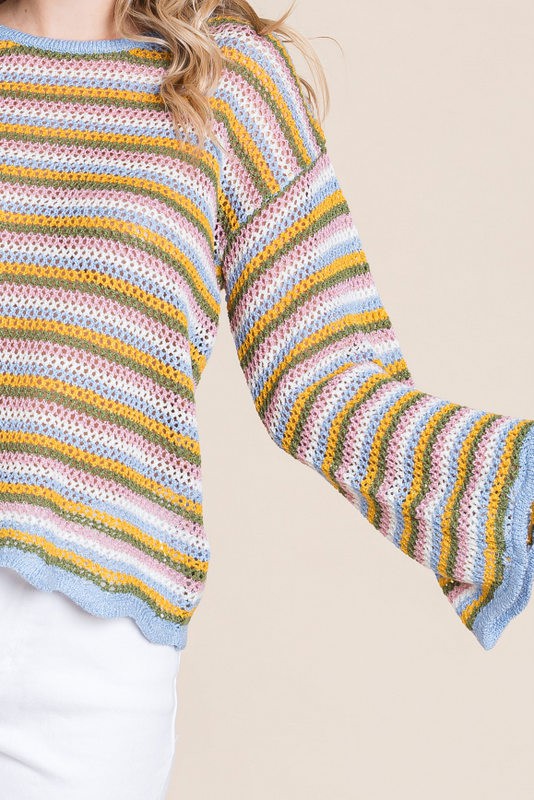 A cute and sweet bell sleeve sheer top, featuring a drop shoulder style, swirl hems, and u-neckline. Made with a lightweight, cool material.