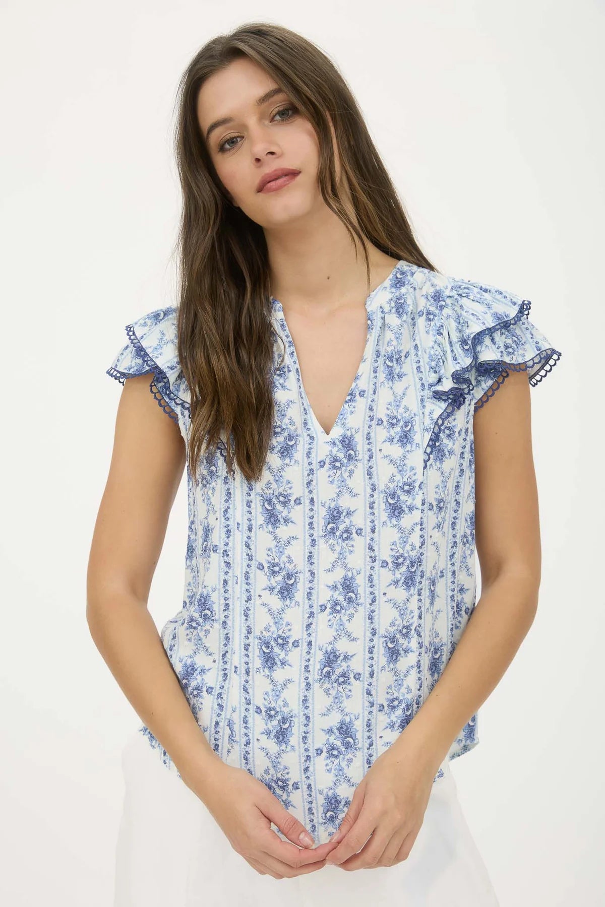 This playful piece features a flattering V-neckline and short ruffle sleeves adorned with delicate scallop lace trim. The relaxed fit and lightweight woven fabric make it perfect for breezy summer days or layering year-round. Effortlessly chic without trying too hard!