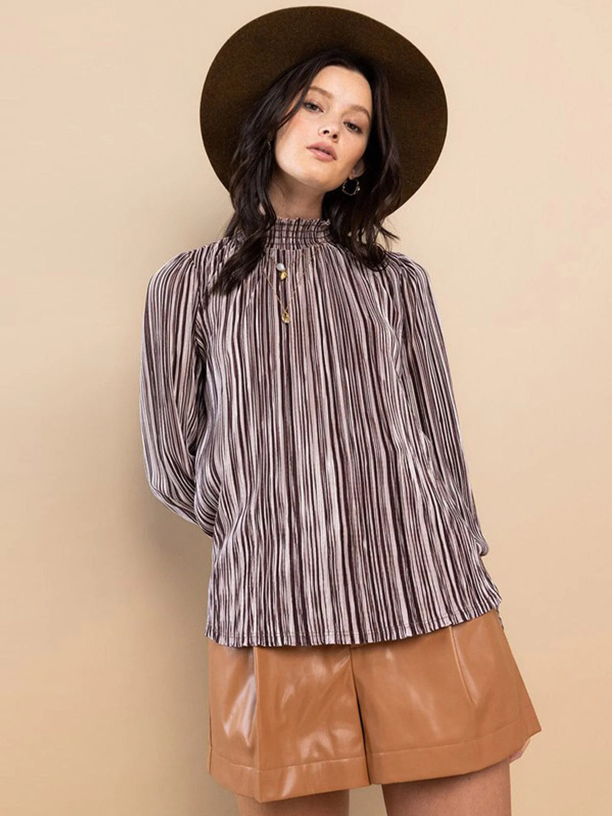 Get ready to stripe up your wardrobe with this playful mock neck blouse! In a charming combo of brown and white, this long-sleeved top features a trendy turtle neck and chic wrist cuffs on the long sleeves. Perfect for adding a touch of whimsy to any outfit!