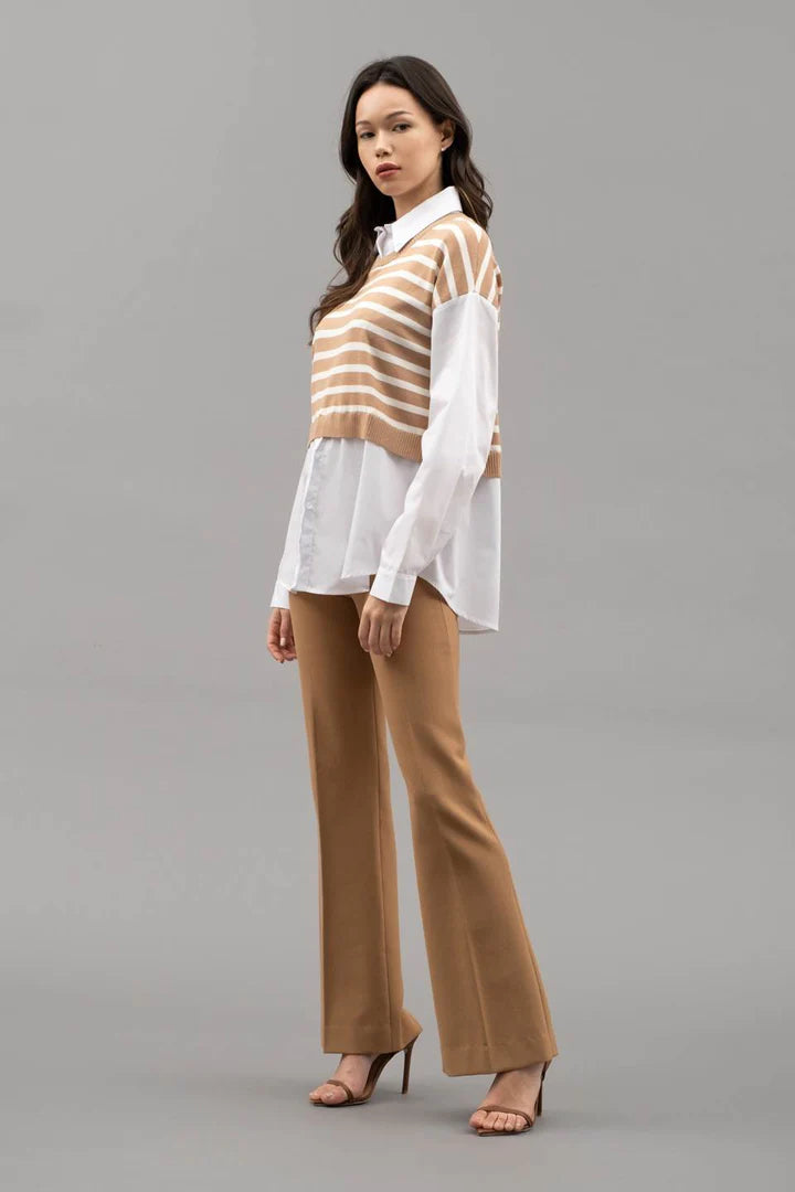 The long-sleeved striped vest top with a collared round neckline is an updated throwback look for the layered look of the 2000's.